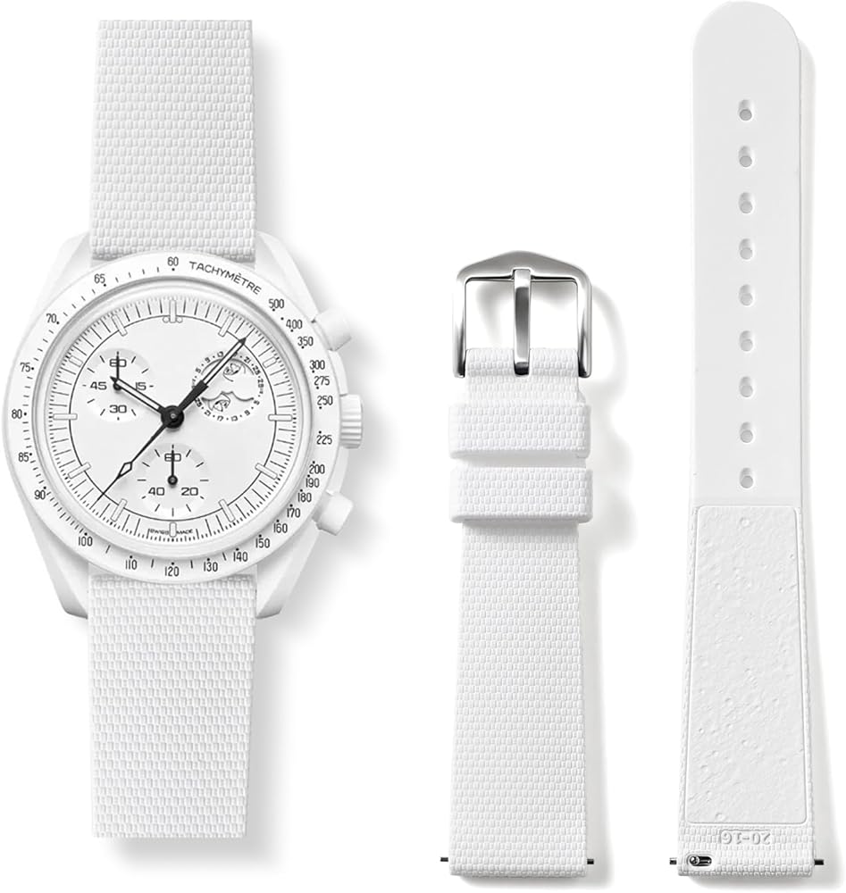 Elevate your omega moonwatch with our collection of premium watch strap with stainless buckle.These straps are designed to be compatible with various models, including compatible Omega x Swatch MoonSwatch Speedmaster and universal 20mm lug watches. Whether you're looking for a nylon strap for Omega Swatch Mercury, Venus, Earth, Mars, Jupiter, Saturn, Uranus, Neptune, Pluto, Sun, Moon Moonphase and universal 20mm watch in general, our selection has you covered.