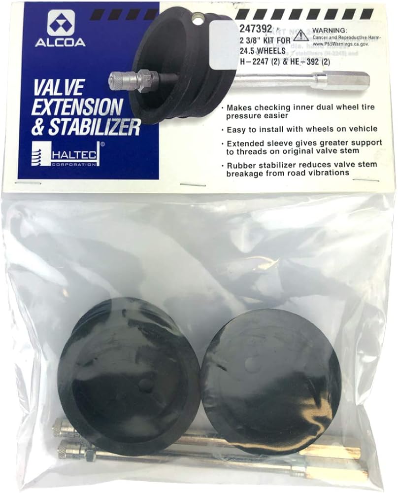 This is an Alcoa 247392 Stabilizer Extension Kit for 24.5 inch wheels with off-center hole positions. This kit includes two H-2247 grommet stabilizers and two HE-392 valve extensions. H-2225 grommet stabilizers work with a 2.375 inch diameter hand hole and HE-392 valve extensions have a 1 inch long collar and a 5-1/8 inch effective length. Proper air pressure is the most important factor in lengthening tire life. On dual wheel assemblies, the inner dual is many times overlooked or improperly serviced. The Alcoa Extension and Stabilizer Kit allows access to the inner dual tire valve and properly positions and supports the extension for servicing. The stabilizer reduces the road vibration on the extension and practically eliminates valve stem breakage caused by vibration. Alcoa Wheels is an American company that produces and processes aluminum products worldwide. They are pioneers and creators of products as common today as aluminum foil and are present in several industries such as aviation and heavy transport. Alcoa Wheels designed the first forged aluminum truck wheel in 1948 and Alcoa represents more than 120 years of experience in the production of aluminum along with more than 60 years in forged aluminum truck wheels and accessories. Their automated production lines guarantee quality standards that meet the most demanding demands of heavy transport. Rest assured that Alcoa products will keep you running down the road.