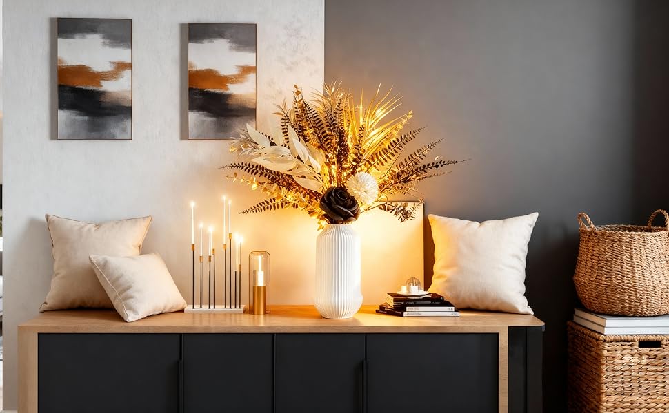 متعددة الوظائف: يمكن استخدام هذه القطعة الفريدة من نوعها من الزهور المزخرفة مع الزهور الاصطناعية الأخرى أو النباتات الخضراء، مما يخلق تباينًا مذهلاً ويعزز التأثير البصري. إنها مناسبة لكل من أنماط الديكور التقليدية والحديثة وهي قطعة مركزية مثالية لطاولة المدخل، مما يعزز الجو الجمالي لأي مساحة.