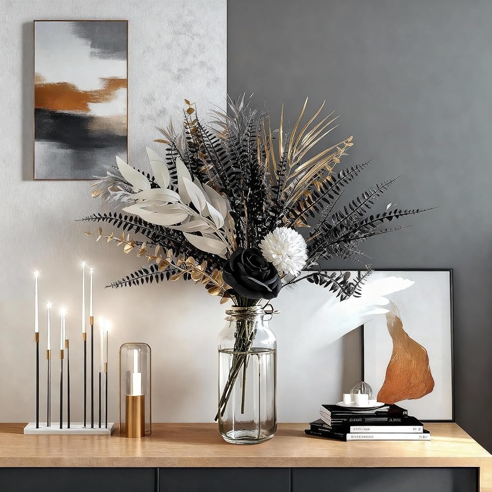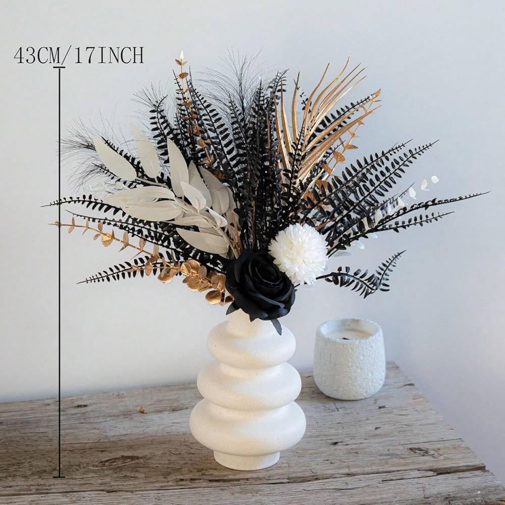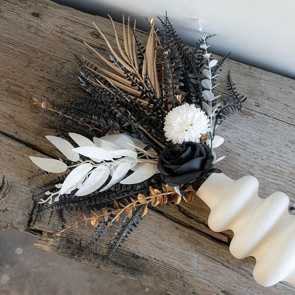 سوف تحصل على: باقة واقعية على طراز Dark Academy و Victorian Gothic، مكونة من اللون الأسود والأبيض والذهبي، بطول إجمالي 17 بوصة. المزهرية الموضحة في الصورة غير متضمنة في بيع المنتج، لذلك يمكنك الجمع بين هذه السيقان المذهلة مع الحاوية المفضلة لديك بحرية. قم بإنشاء تنسيق زهور فريد يناسب تمامًا أسلوبك الشخصي الفريد وجماليات منزلك.