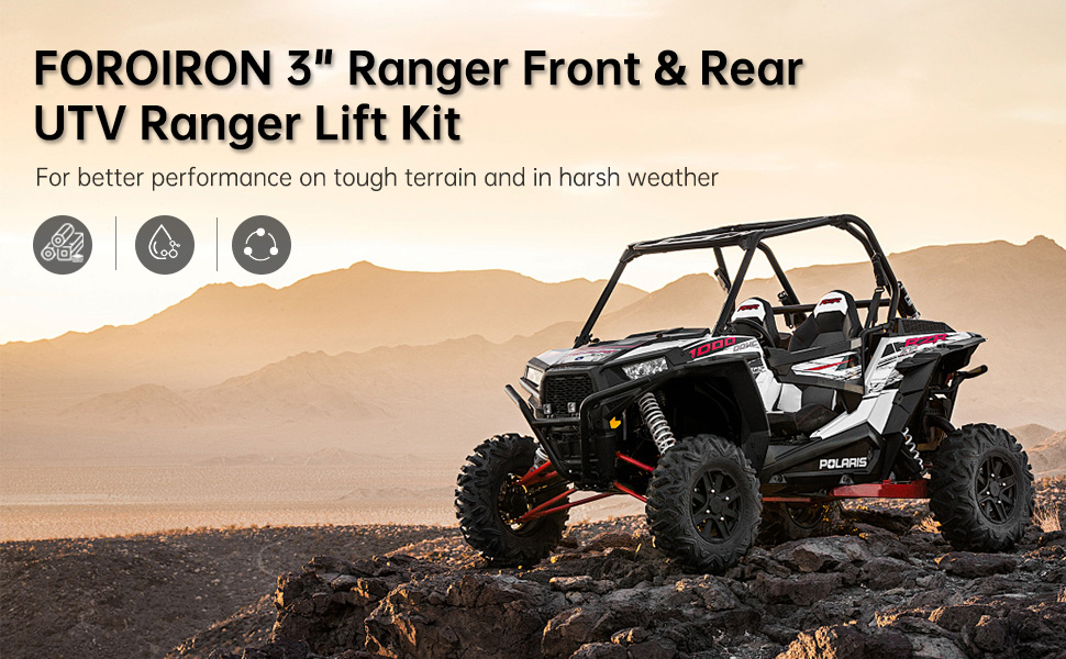 • الوظيفة: توفر مجموعة رفع FOROIRON UTV Ranger رفعًا كاملاً بمقدار 3 بوصات أمامية وخلفية، مما يزيد بشكل كبير من الخلوص الأرضي للتغلب على الصخور والجذور والعقبات بسهولة. تتيح لك هذه الترقية التعامل مع المسارات الأكثر تحديًا والتنقل في الأراضي الوعرة دون القلق بشأن التعثر، مع تحسين زوايا الاقتراب لقيادة أكثر سلاسة على الأسطح غير المستوية