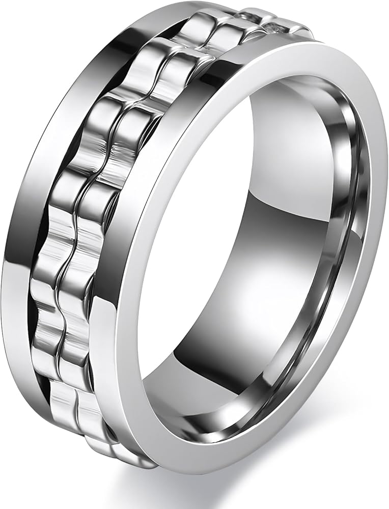 تفاصيل المقاس - عرض 8 مم، مقاس الخاتم الأمريكي 9 (يتوفر جدول المقاسات 6-13). حلقة دوارة مزدوجة فضية مثل ألعاب الأصابع لتخفيف التوتر، تساعد بشكل فعال على تخفيف القلق والتوتر أو المشاعر السلبية الأخرى. مصمم بمقاس مريح وسطح داخلي أملس، مما يوفر ملاءمة مريحة ويقلل الضغط على الإصبع.