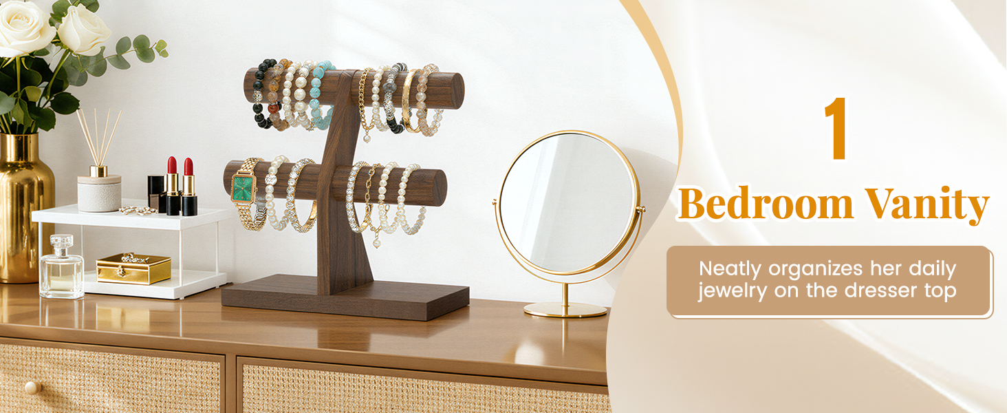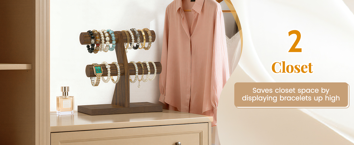• 𝐄𝐥𝐞𝐠𝐚𝐧𝐭 & 𝐅𝐮𝐧𝐜𝐭𝐢𝐨𝐧𝐚𝐥 𝐃𝐞𝐬𝐢𝐠𝐧: تصميم T-bar، جنبًا إلى جنب مع نسيج خشبي عتيق، يجلب الجمال والعملية. يسمح لك حامل السوار الخشبي هذا بعرض كل سوار بشكل واضح وأنيق، مما يجعله إضافة مثالية لخزانة الملابس أو خزانة الملابس أو منطقة عرض المجوهرات. يمكن استخدامه كمنظم عملي وقطعة ديكور أنيقة