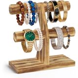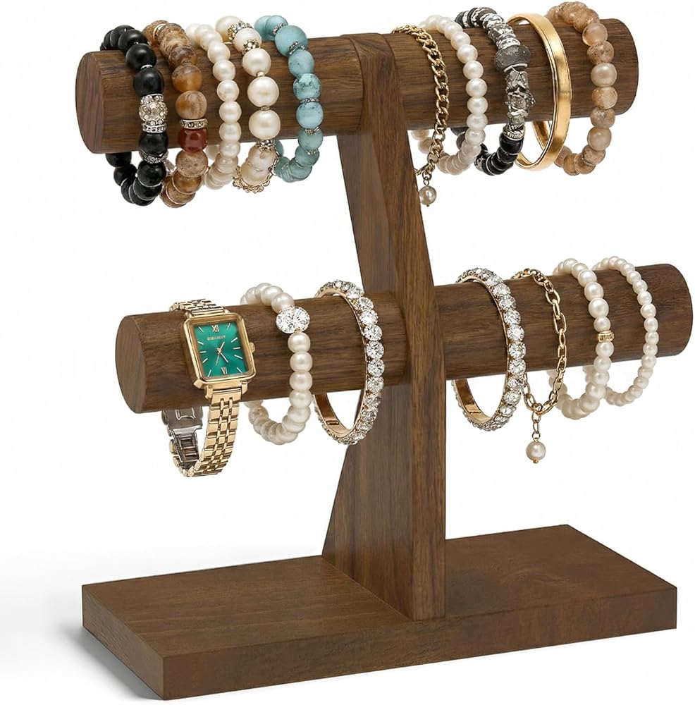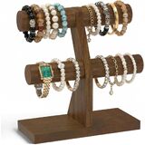 Esluker.ly حامل سوار عرض منظم حامل خشبي، رف تخزين سوار T Bar لبائعي الأعمال المنزلية، سعة كبيرة 2 برج شجرة المجوهرات للساعات، بدون فوضى، بني