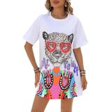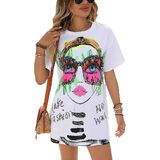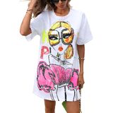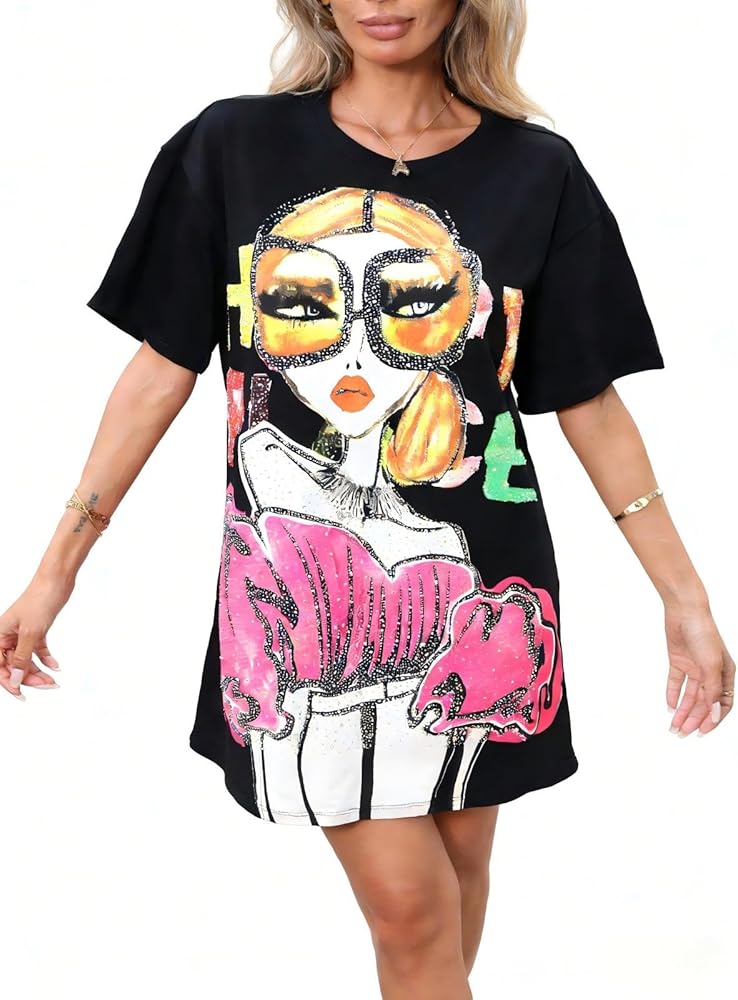 التصميم: تي شيرت مطبوع عليه شخصية نسائية، نمط شخصية مطبوع بالكامل، نص بنمط الهيب هوب متراكب، صناعة مرصعة بالألماس جزئيًا، صناعة ممتازة، نسخة فضفاضة