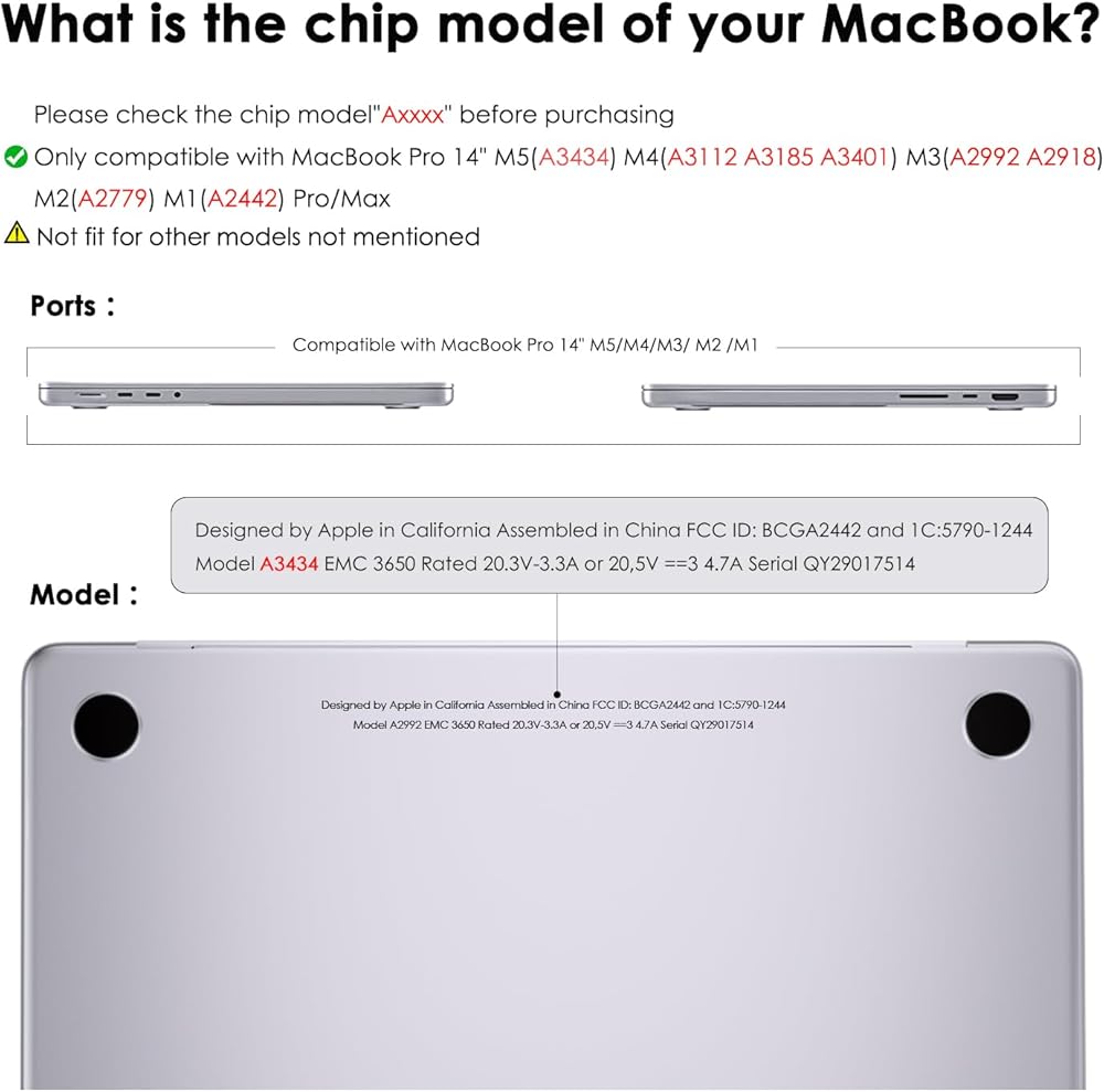 【النماذج القابلة للتطبيق: متوافقة فقط مع إصدار MacBook Pro 14 بوصة 2026 2025 2023 2022 2021. نموذج الشريحة: M5 (A3434 A3426 A3427)/ M4 (A3112 A3185 A3401)/ M3 (A2992 A2918)/ M2 (A2779)/ M1 (A2442) Pro/Max. يرجى التحقق من رقم الطراز "AXXXX" الموجود على الجزء الخلفي من جهاز Mac الخاص بك قبل الشراء.