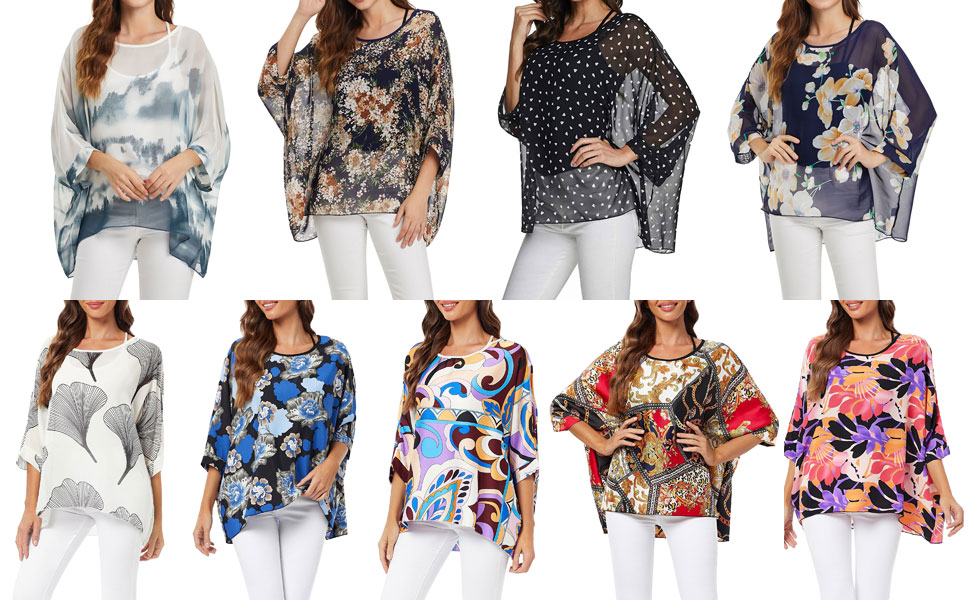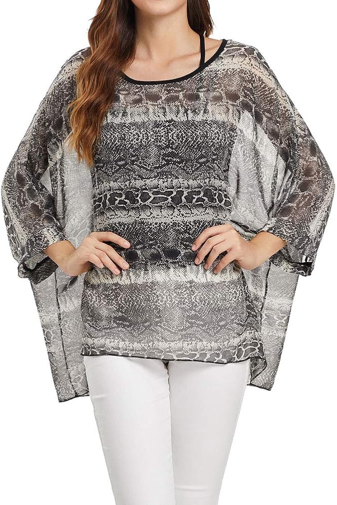 - قميص بطبعات مبتكرة، بلوزات شيفون شبه شفافة، سترة فضفاضة للشاطئ، بلوزة فضفاضة بأكمام جناح الخفاش