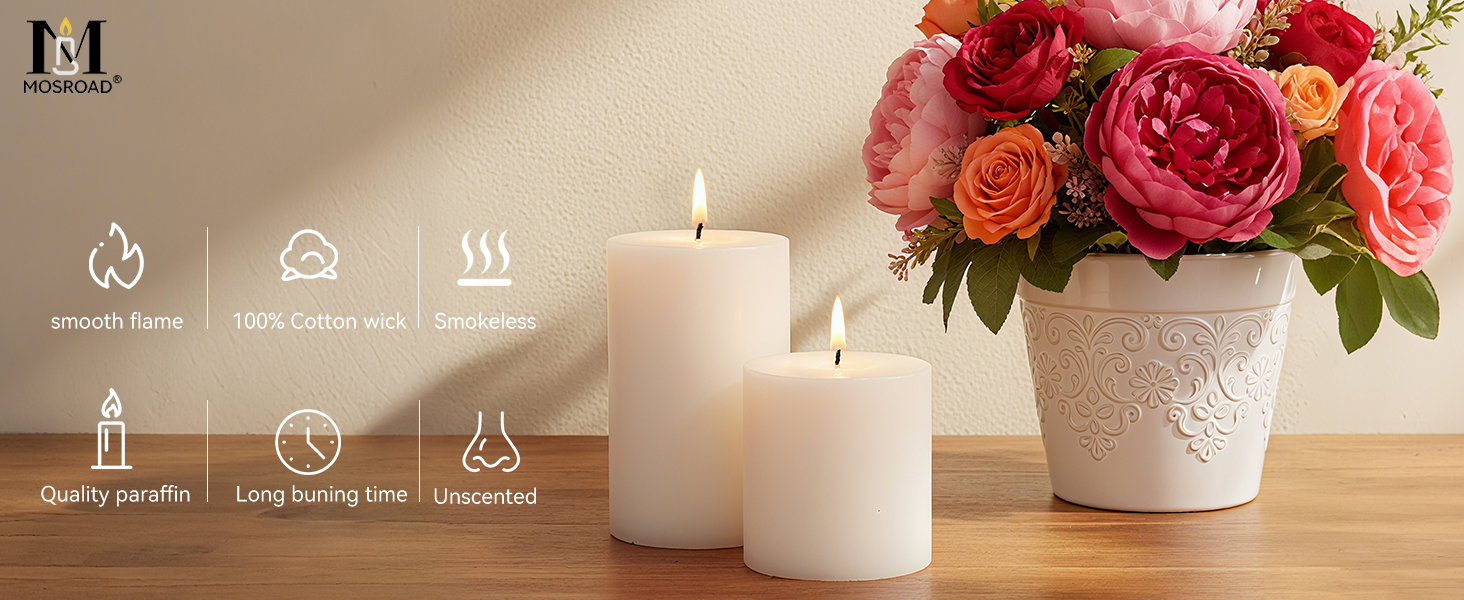 شمع وفتائل قطنية عالية الجودة: شمعة عمودية بيضاء مقاس 10.16 سم من MOSROAD مصنوعة من شمع البارافين عالي الجودة، تتميز هذه الشموع بملمس كثيف وناعم يقاوم الاعوجاج ويضمن حرقًا بطيئًا ومتساويًا. كل شمعة مزودة بفتيل قطني 100% - خالي من الرصاص أو الإضافات القاسية - الذي ينتج لهبًا ثابتًا دون تناثر. لا يعمل هذا المزيج من المواد الممتازة على إطالة عمر الشموع فحسب، بل يضمن أيضًا حرقًا آمنًا ومتسقًا يمكنك الوثوق به لساعات طويلة.