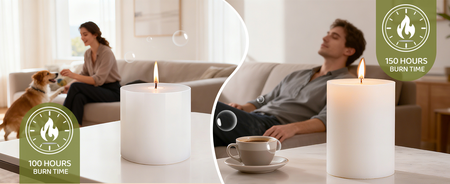 وقت حرق طويل 100 ساعة لكل شمعة: استمتع بطول عمر استثنائي مع 100 ساعة من وقت الحرق لكل شمعة مقاس 4x4 بوصة. سواء كنت تضيء واحدة للاسترخاء ليلاً، أو تستخدم كليهما لعرض عطلة لمدة أسبوع، أو تعتمد عليها في حدث متعدد الأيام، فإن وقت الحرق الممتد للشمعة الكبيرة مقاس 10.16 سم يعني بدائل أقل وأجواء متواصلة أكثر.