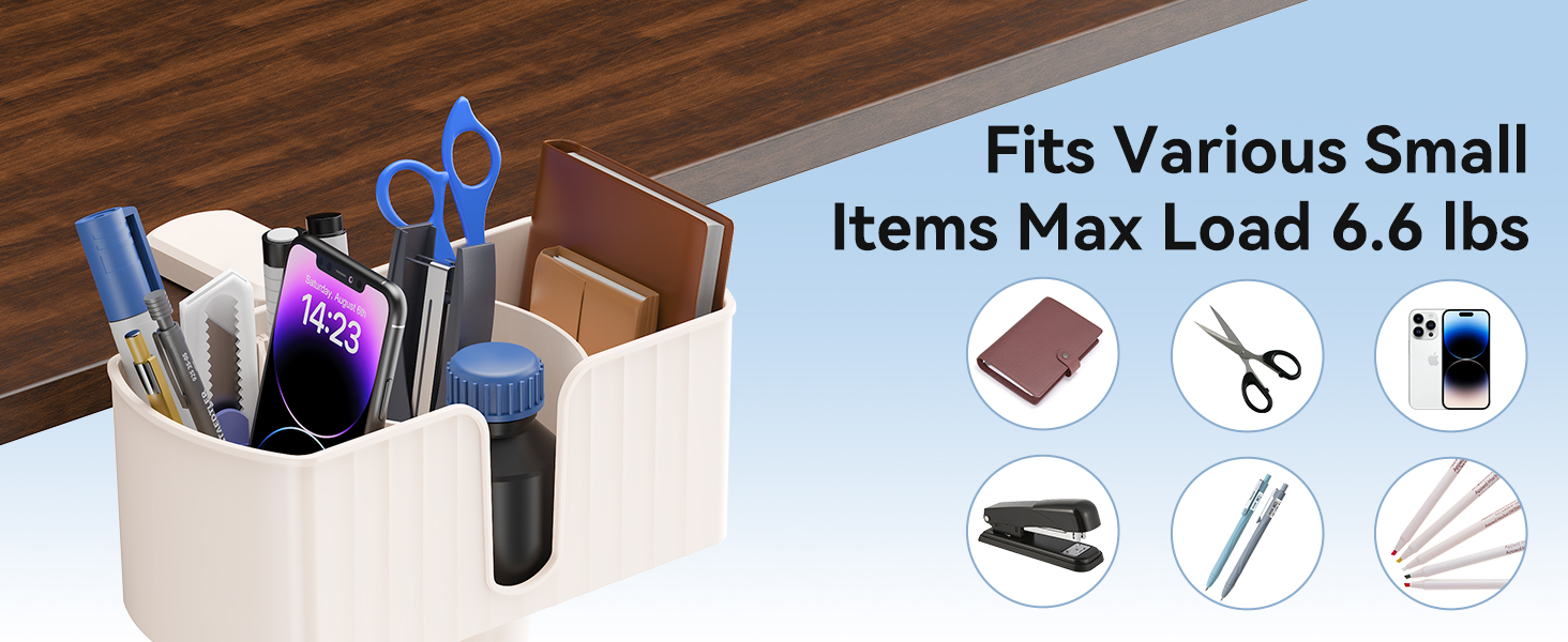 سهل التركيب والإزالة - مزود بزر ضغط للضبط، يتيح هذا المنظم التشغيل بيد واحدة للتركيب السريع على المكاتب وطاولات الألعاب والأرفف والمزيد. يتم تثبيته بأمان في مكانه بمجرد الضغط عليه، دون الحاجة إلى صمغ أو ثقب - الإعداد سهل، مما يحافظ على مكتبك أنيقًا ومنظمًا!