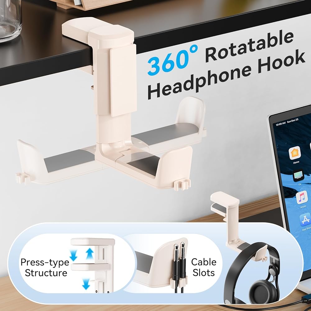 دوران 360 درجة وقابل للفصل - يتميز خطاف سماعة الرأس الموجود أسفل المكتب بدوران 360 درجة، مما يسمح بإخفائه بدقة عند عدم الاستخدام. القابل للفصل
