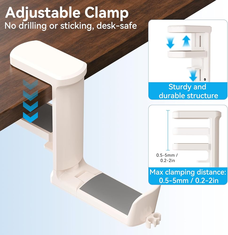 توافق عالمي - مصمم للتثبيت على الطاولات بسُمك 5-50 مم، ويناسب معظم المكاتب بسلاسة. يعمل حامل سماعة الرأس مع جميع سماعات الألعاب ذات الحجم القياسي، وسماعات الرأس الصوتية فوق الأذن، وسماعات الرأس الموجودة فوق الأذن. لا يقتصر الأمر على المكاتب - قم بتركيبه في المكاتب أو غرف المعيشة أو غرف النوم أو أي مساحة تحتاج إلى مساحة تخزين إضافية لاستخدامات متعددة.