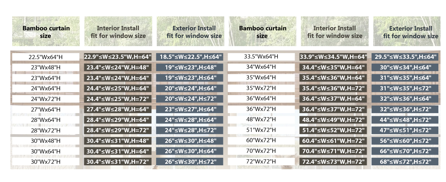 【مقاسات متعددة متاحة】نحن نقدم مجموعة واسعة من المقاسات للاختيار من بينها، مما يوفر خيارات للتركيب الداخلي والخارجي. ما عليك سوى طرح 0.4 بوصة لعرض الستارة للتركيب الداخلي، أو إضافة 0.4 بوصة للتركيب الخارجي.