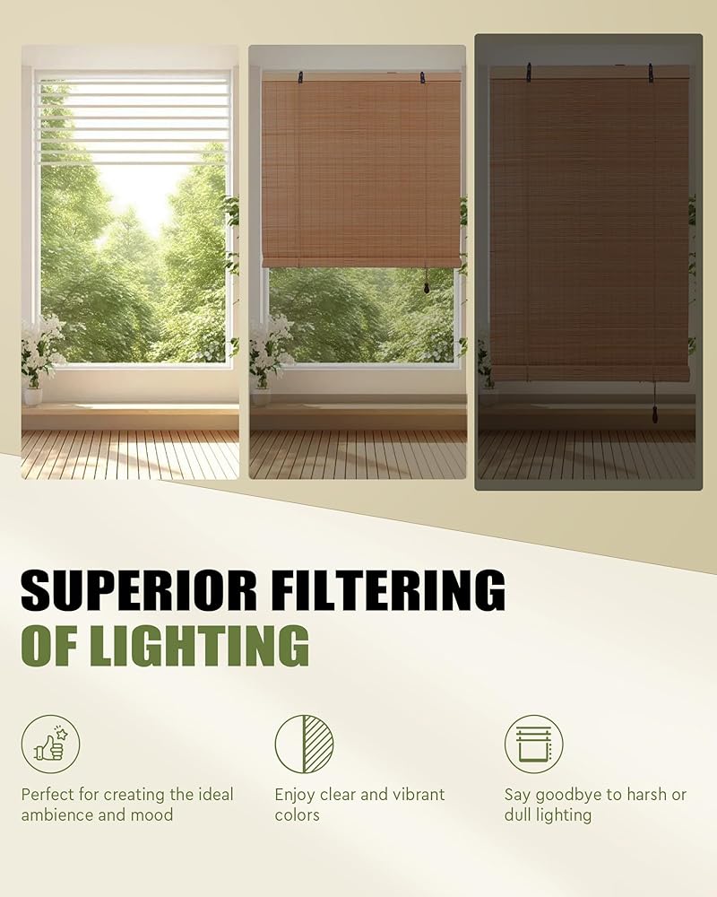 【إضاءة قابلة للتعديل】يمكن تعديل طول وفتح/إغلاق هذه الستائر الدوارة المصنوعة من الخيزران للتحكم في الضوء والسطوع المطلوب في الغرفة. تخلق هذه الستائر بيئة دافئة ومريحة للضوء والظل توفر الاسترخاء التام.