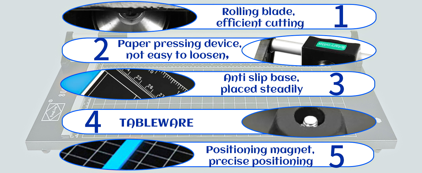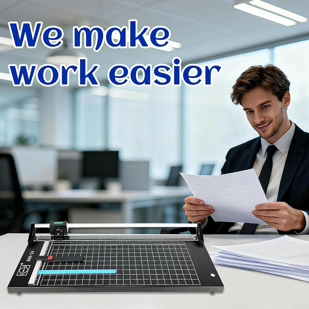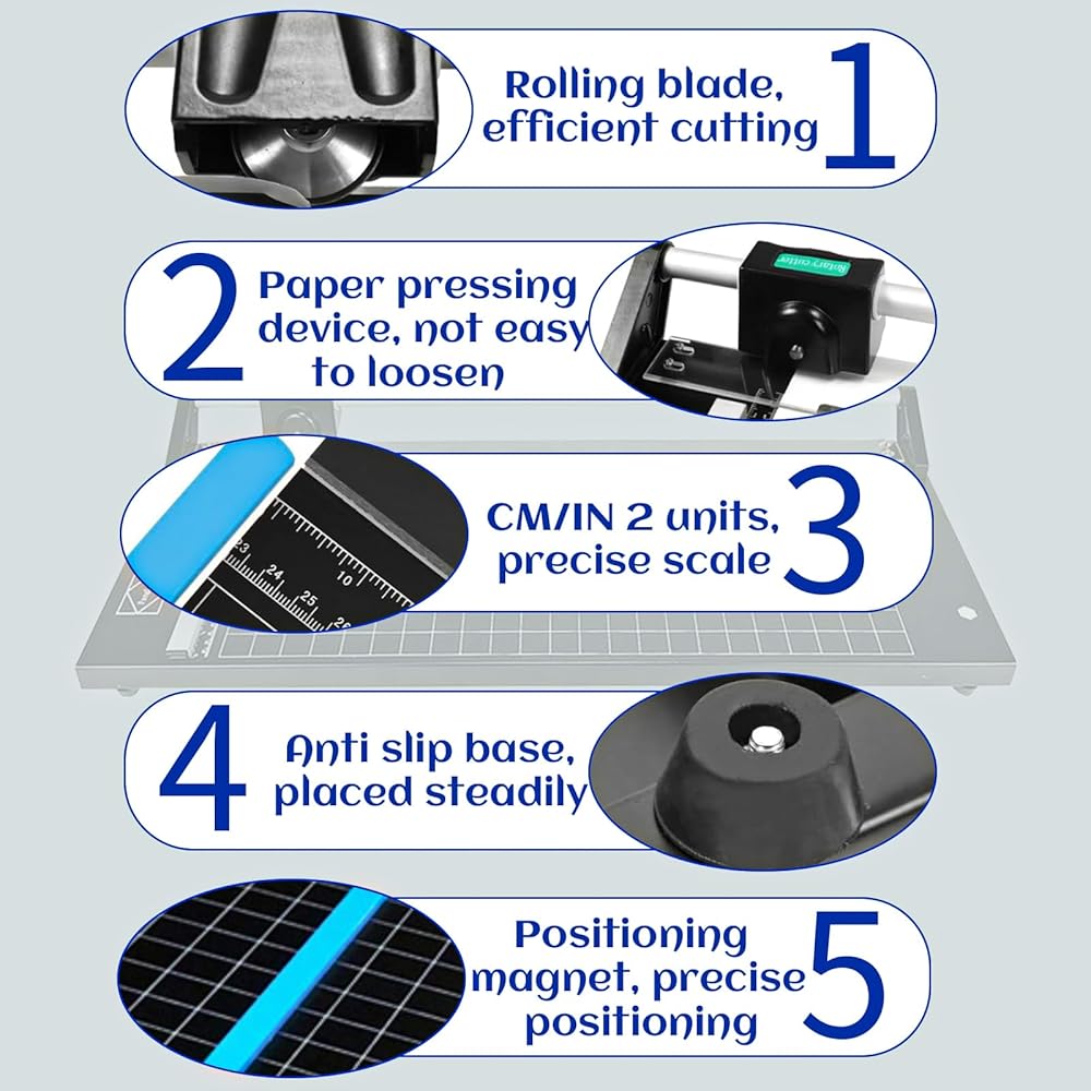 وزن الورق التلقائي والموازين الدقيقة: يتميز بتصميم تلقائي لوزن الورق، مقترنًا بشفرة دوارة ذاتية الطحن وجسم أداة الطحن - مما يحافظ على الشفرة حادة ومتينة للاستخدام طويل الأمد. مجهزة بمقاييس قياس بالسنتيمتر والبوصة، مما يضمن الراحة والدقة والعملية لجميع مهام القطع.