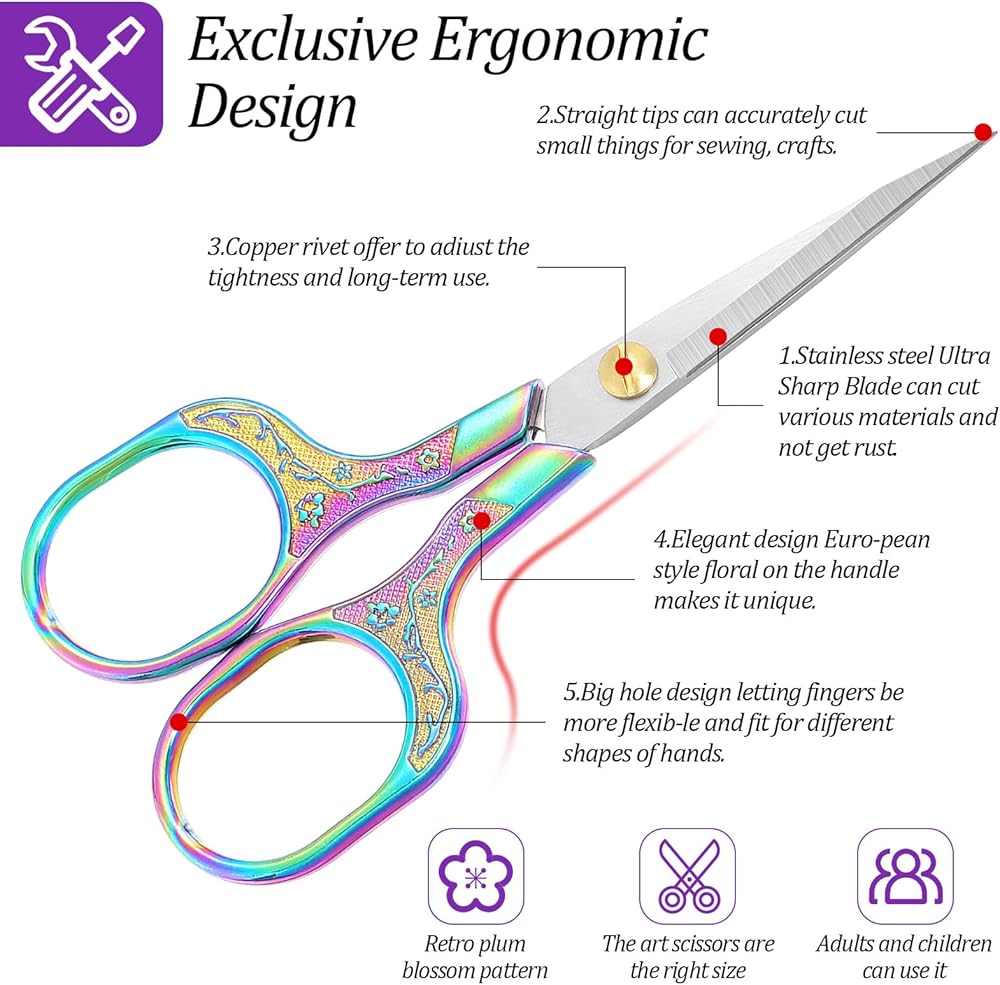 • 【Ergonomic & Decorative】The vintage floral handle design is not only aesthetically pleasing but also provides a comfortable, secure grip. These small precision scissors are a functional and beautiful addition to any sewing box, craft room, or workspace, making them an excellent gift for enthusiasts and professionals.