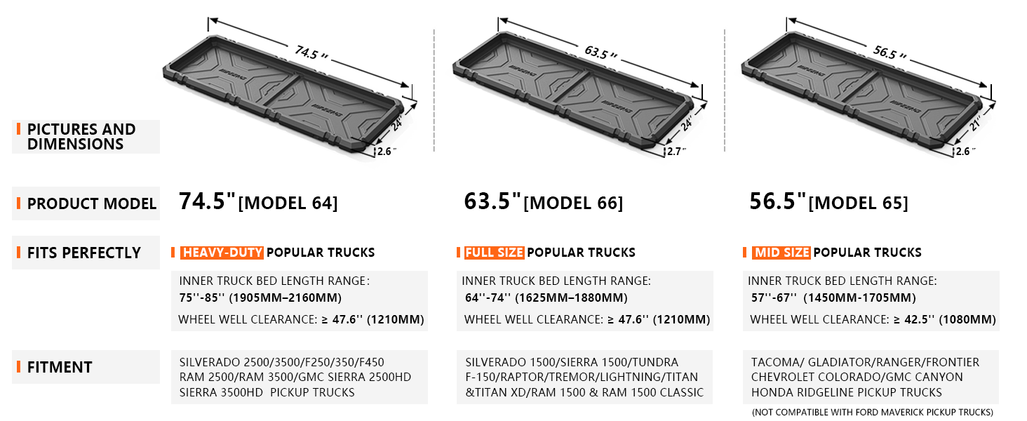 الإعداد: صواني تخزين سرير الشاحنة متوافقة مع شاحنات بيك اب Silverado 2500/3500/F250/350/F450 /RAM 2500/RAM 3500 /GMC Sierra 2500HD /Sierra 3500HD. سرير كامل الحجم فائق التحمل: مقاس 75 بوصة عمق × 24 بوصة عرض × 2.6 بوصة يناسب الشاحنات الشهيرة المجهزة بسرير مقاس 6 أقدام و7 بوصات. سيناريوهات التطبيق الأمثل: تناسب تمامًا أسِرَّة الشاحنات بطول داخلي يبلغ 75 بوصة ~ 85 بوصة (1905 مم - 2160 مم) وخلوص العجلة يتجاوز 47 بوصة (1210 مم)