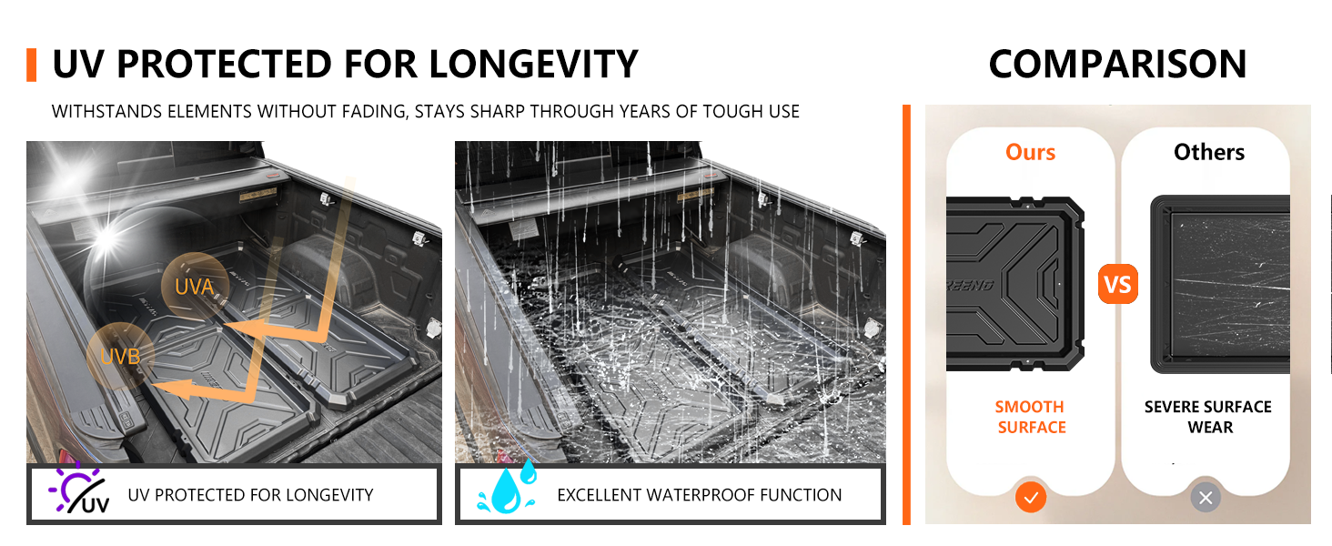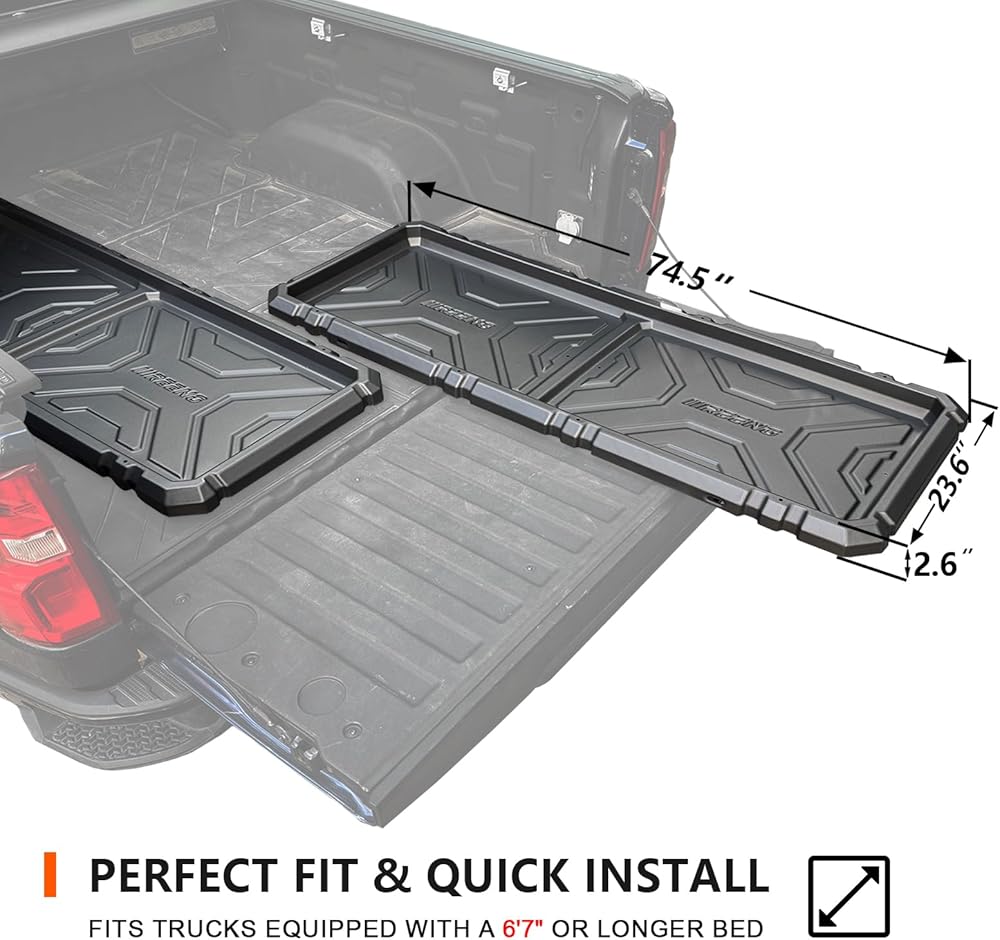 تركيب بدون متاعب وبدون حفر: استمتع بإعداد سريع وخالي من الأدوات مع صينية سرير الشاحنة المنزلقة للخارج - لا حاجة إلى حفر أو تعديلات دائمة. تسقط الشرائح مباشرة على سرير النقل الخاص بك، وتظل آمنة تحت غطاء سرير الشاحنة أو على المعدن العاري. يمكن إزالته بسهولة عندما تحتاج إلى الوصول إلى سرير الشاحنة بالكامل، مما يجعله ملحق الشاحنة المثالي للعمل أو المغامرة.