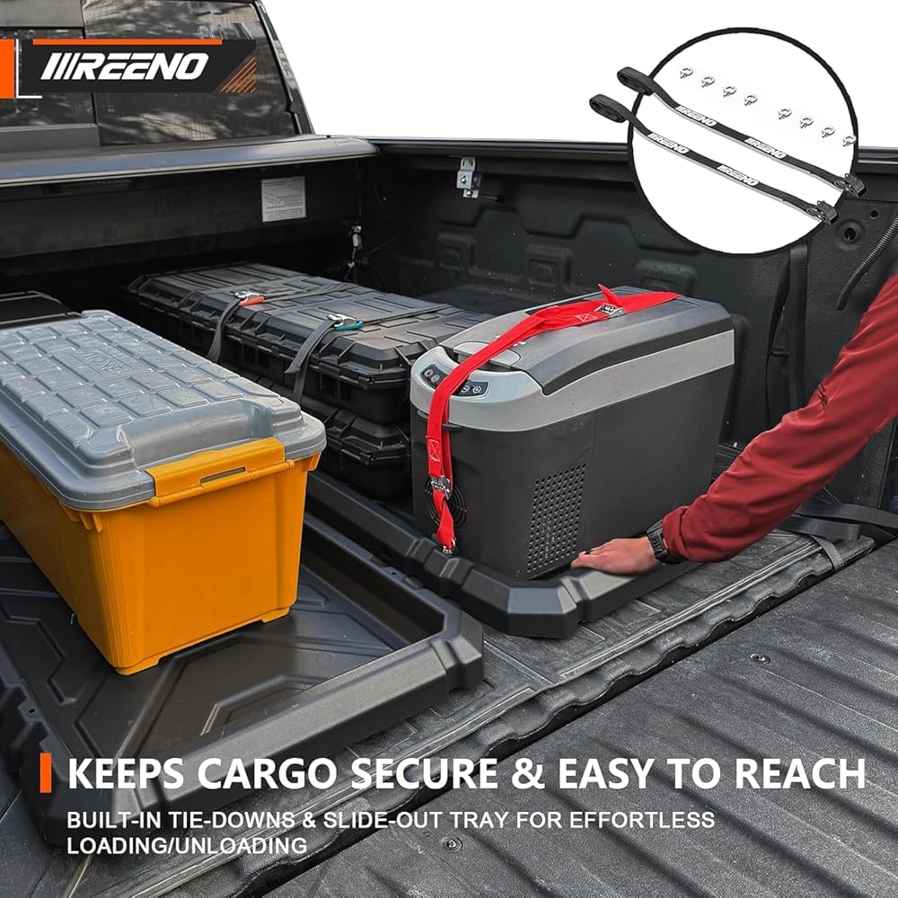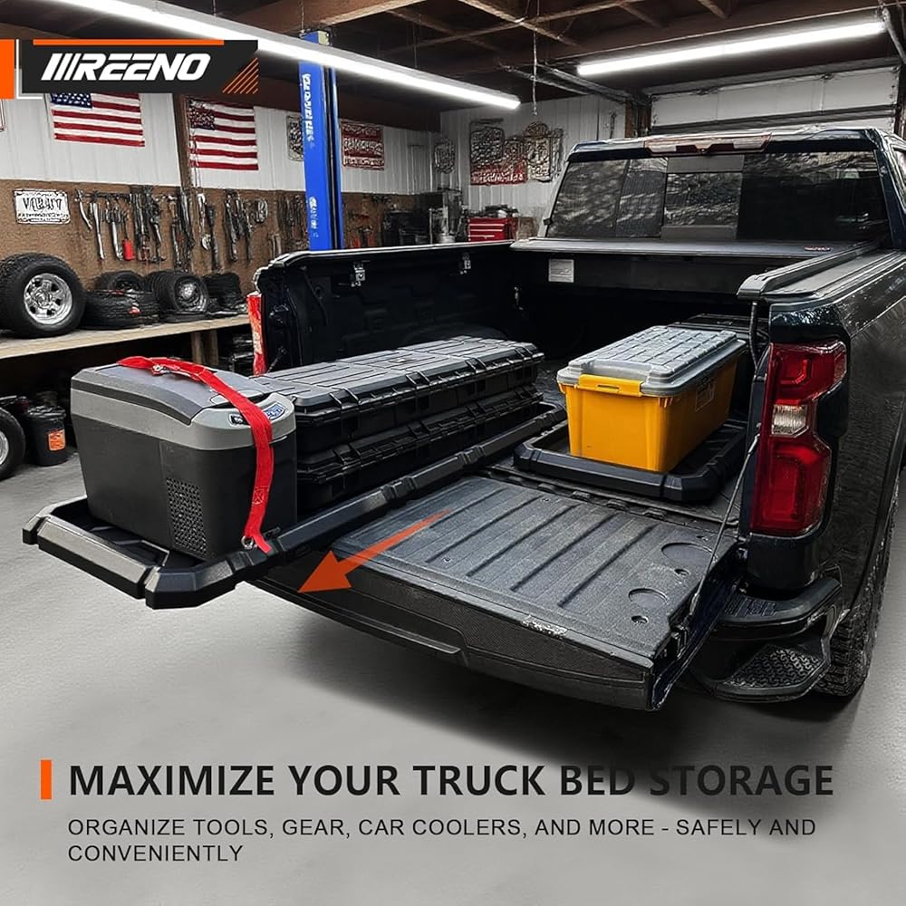صينية تنظيم سرير الشاحنة المنزلقة للخارج، نظام تخزين البضائع عالي التحمل مع سهولة الوصول إلى الباب الخلفي، يناسب منظم سرير فائق التحمل بالحجم الكامل مقاس 6'7 بوصات، مادة HDPE متينة، بدون حفر