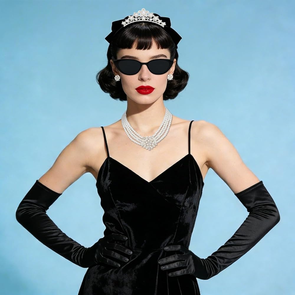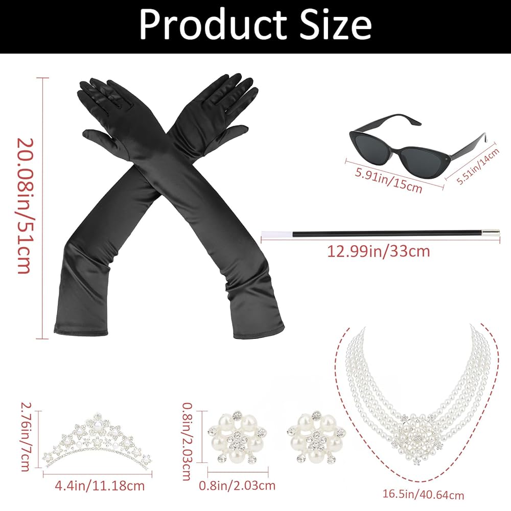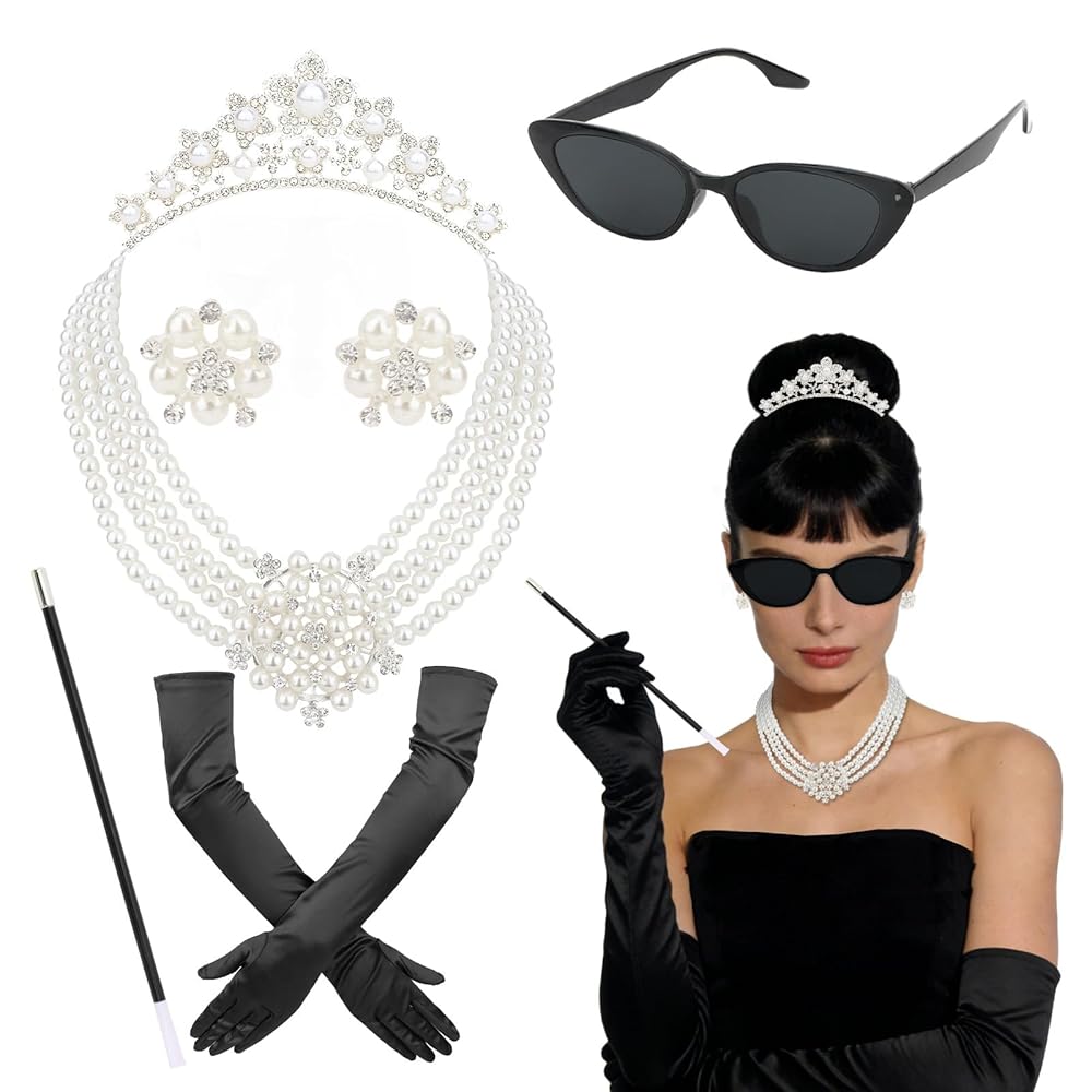 مجموعة أيقونات كاملة من الستينيات: تشتمل هذه المجموعة المتكاملة على تاج وقلادة لؤلؤ متعددة الخيوط وأقراط ونظارات شمسية على شكل عين القطة وقفازات من الساتان وحامل سجائر، حتى تتمكن من إنشاء مظهر أصلي مستوحى من هولي جوليتلي دون خلط أو مطابقة القطع المنفصلة.