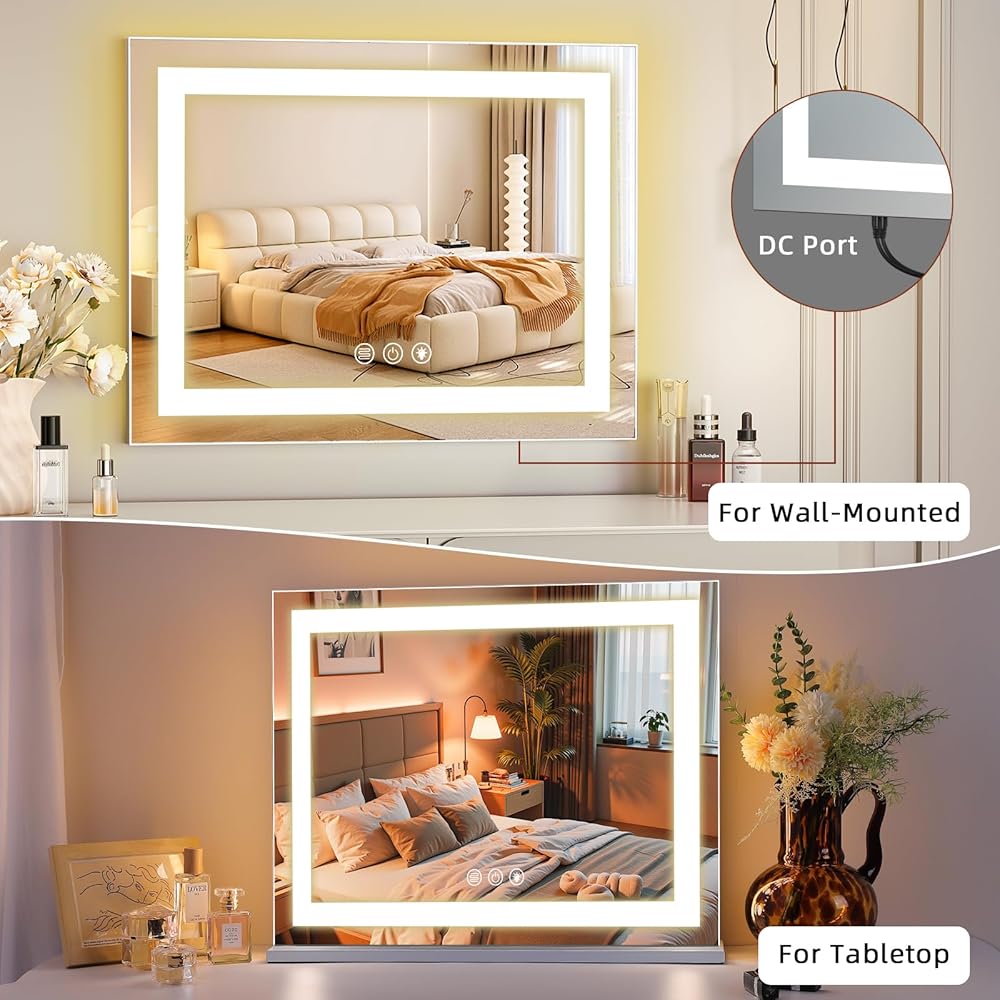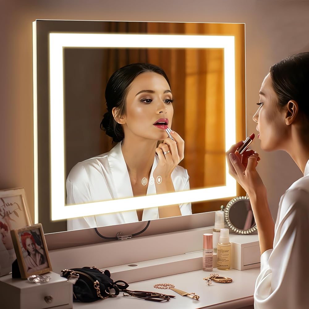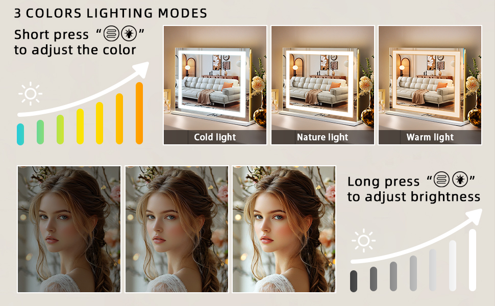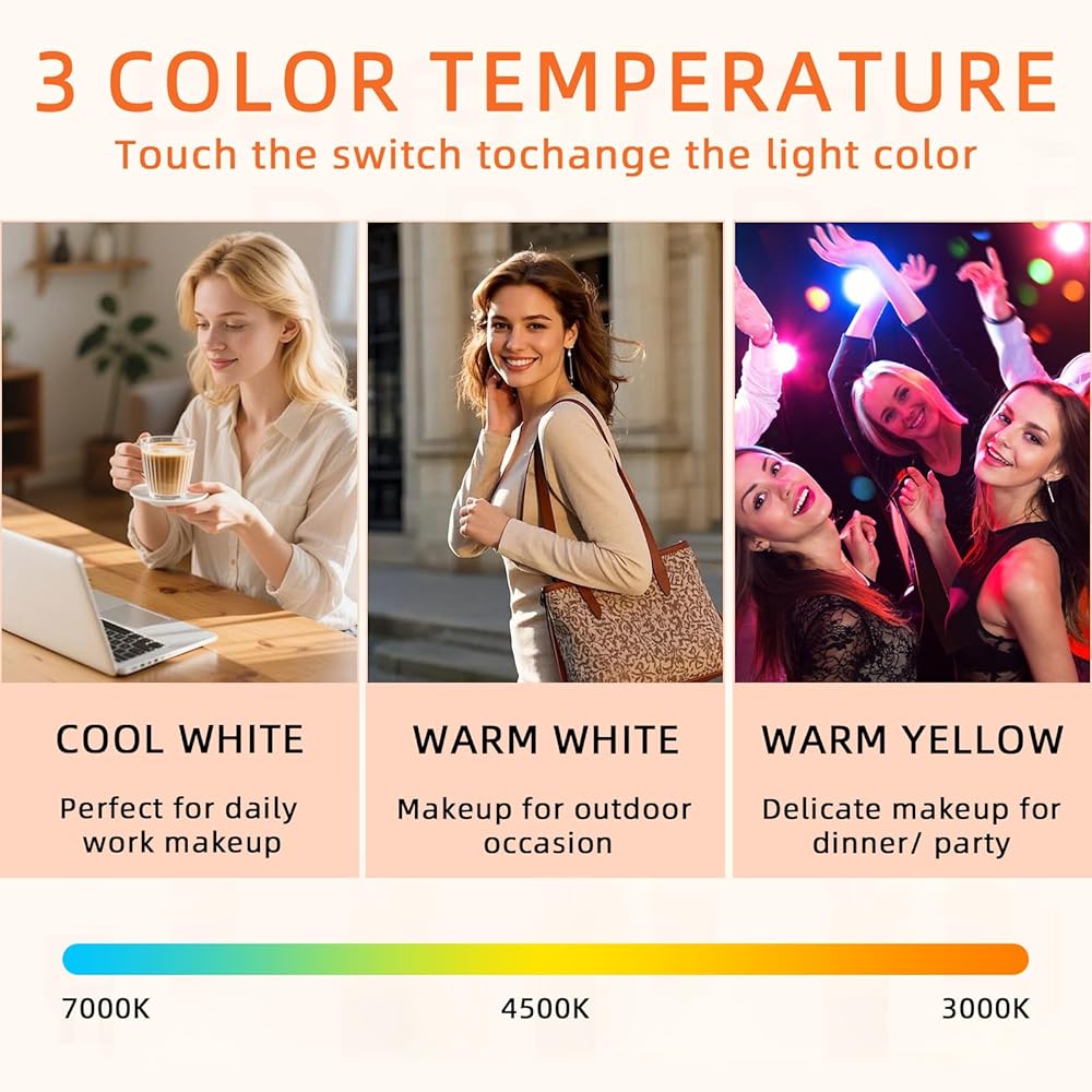 【وظيفة السطوع والذاكرة قابلة للتعديل】يمكن لمرآة الزينة المضيئة هذه ضبط السطوع بسهولة بضغطة لتلبية احتياجاتك الفردية. كما أنها تحتوي على وظيفة ذاكرة ذكية تتذكر إعدادات الإضاءة المفضلة لديك، مما يسمح لك بالبدء فورًا في روتين العناية بالبشرة أو الماكياج دون الحاجة إلى إجراء تعديلات متكررة.