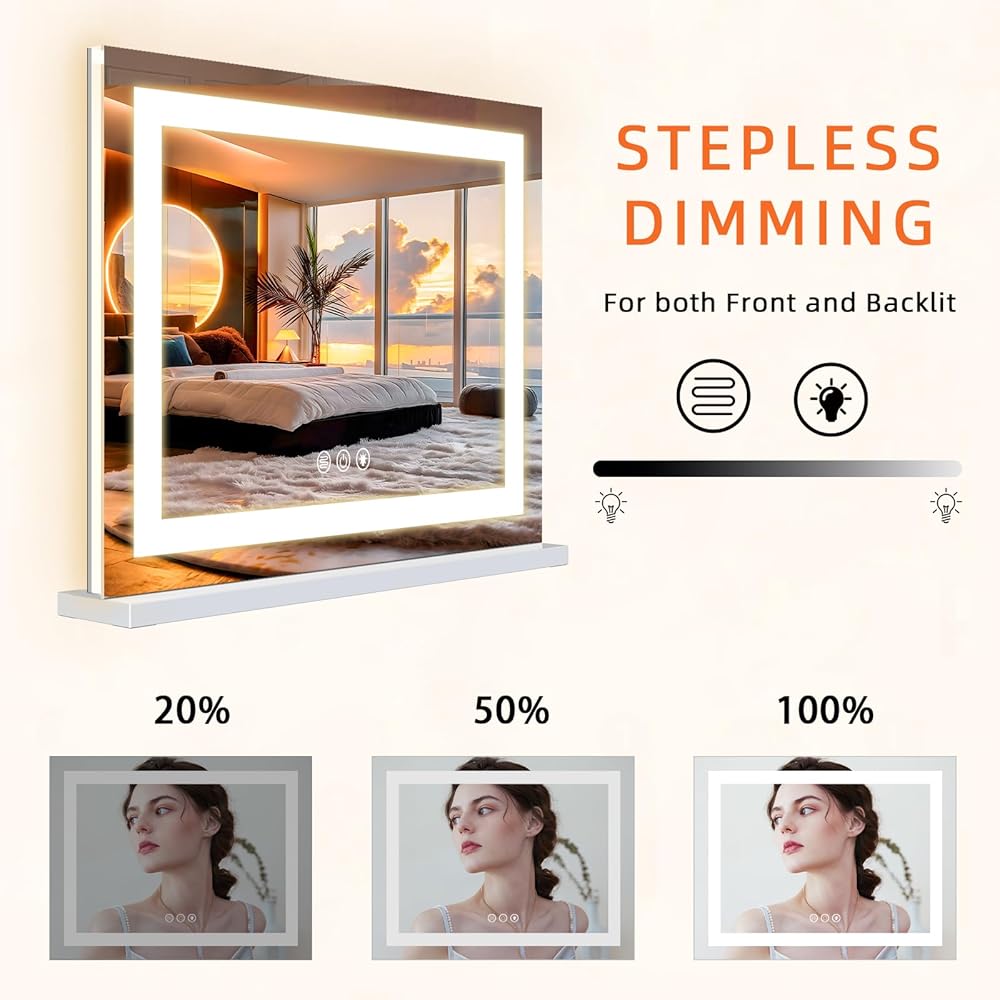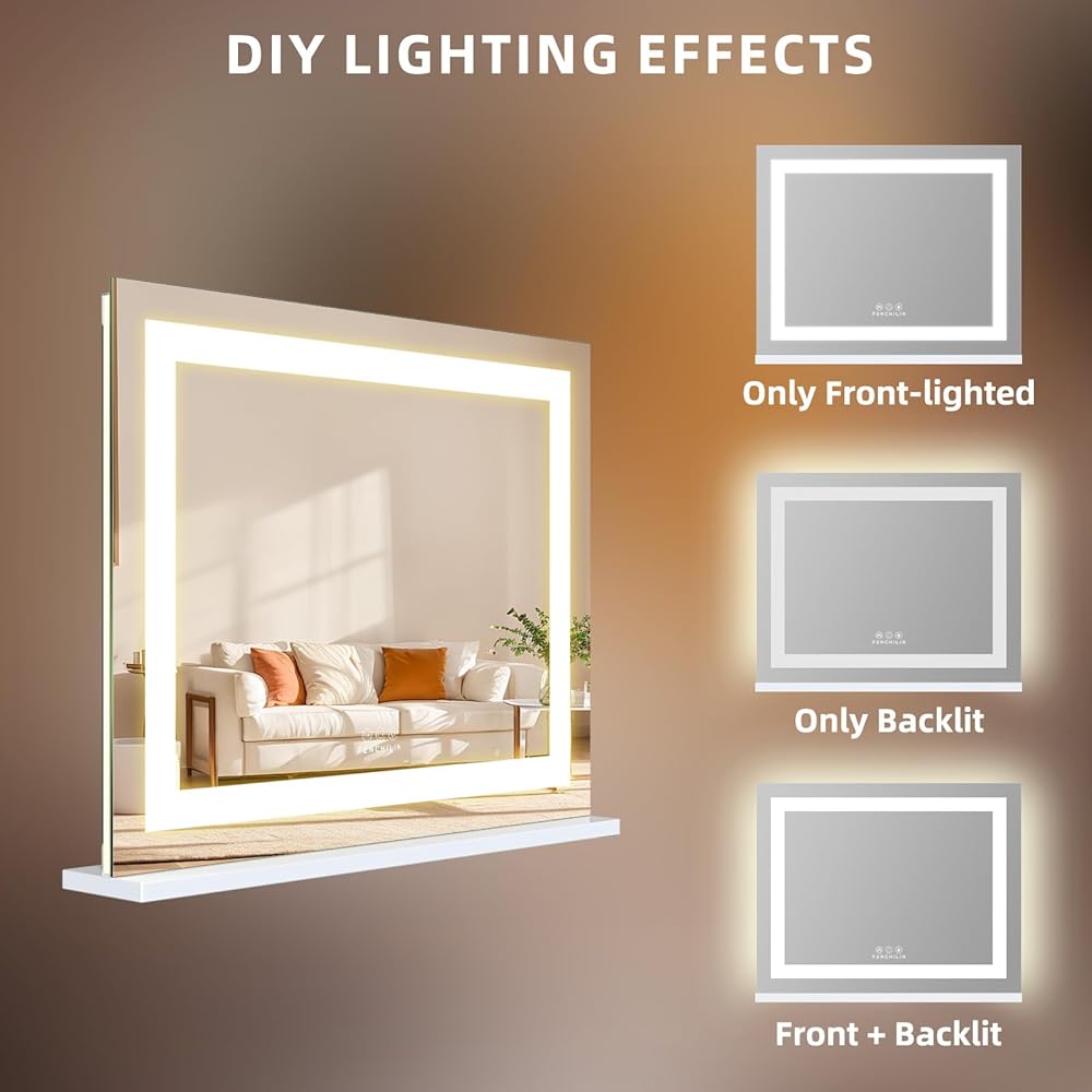 【مرآة مكياج بنظام إضاءة خلفية + إضاءة أمامية مزدوجة】تتميز مرآة الزينة هوليوود المزودة بمصابيح بأوضاع إضاءة أساسية: ضوء دافئ (3000 كلفن)، ضوء أبيض (4500 كلفن) وضوء بارد (7000 كلفن). تحسين الإضاءة الخلفية، تحتوي أيضًا على 3 أوضاع إضاءة، يمكن تحديد الإضاءة الخلفية بلون معين، مما يمنحك مجموعة واسعة من الظلال للاختيار من بينها، مما يجعل مرآة المكياج المزودة بإضاءة LED مع الضوء أداة مكياج مثالية وديكور غرفة فاخر لغرفة نومك