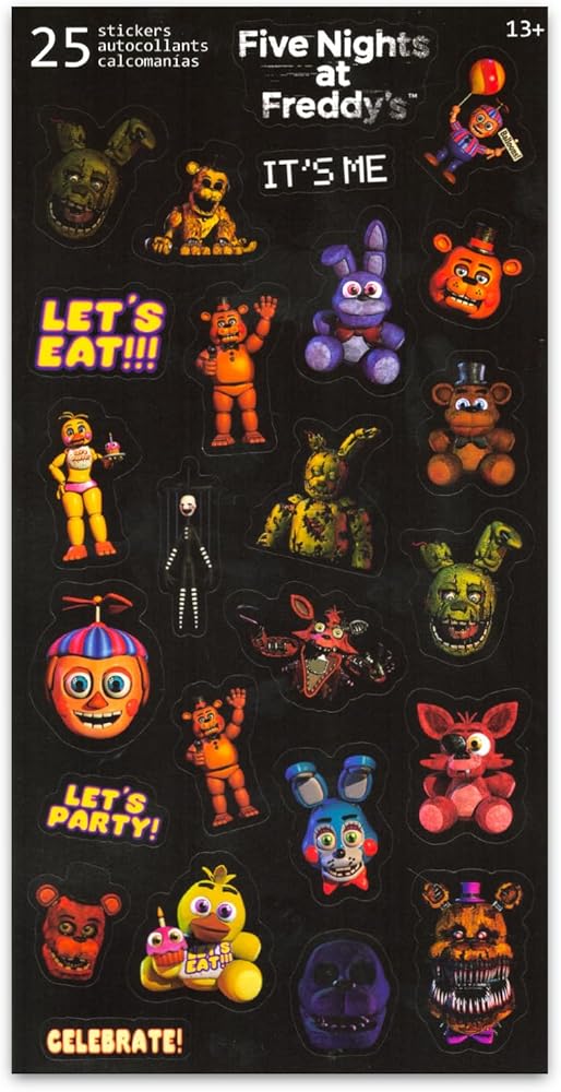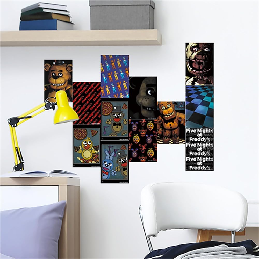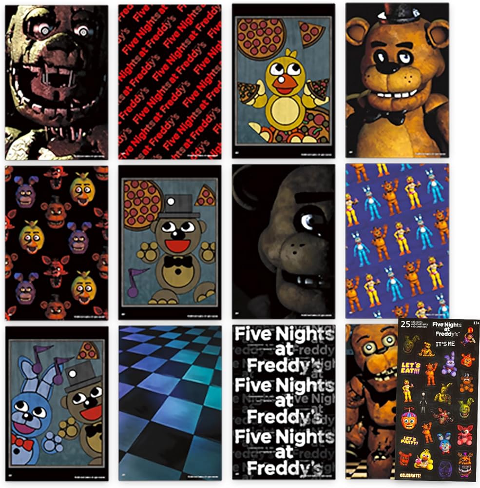 Mini Five Nights at Freddy's Posters Set - Video Game Wall Art Bundle Includes 12 FNAF Mini Room Posters (4" x 6") Plus Stickers | Five Nights at Freddy's Decorations for Kids. This Five Nights at Freddy's mini poster party pack features colorful artwork of all your favorite FNAF characters including: Freddy Fazbear, Bonnie, Chica, and Foxy. Includes 12 high quality mini Five Nights at Freddy's posters -- each poster for wall measures 4 x 6 inches, which is about the size of a postcard. The perfect size for walls, lockers and offices! This Five Nights at Freddy's poster collage pack is the perfect gift for your favorite FNAF enthusiast! Use these Five Nights at Freddy'sposters to decorate at your next Minecraft themed birthday party. Officially licensed Five Nights at Freddy's mini room decorations for girls and boys alike. Set also includes Five Nights at Freddy's stickers.