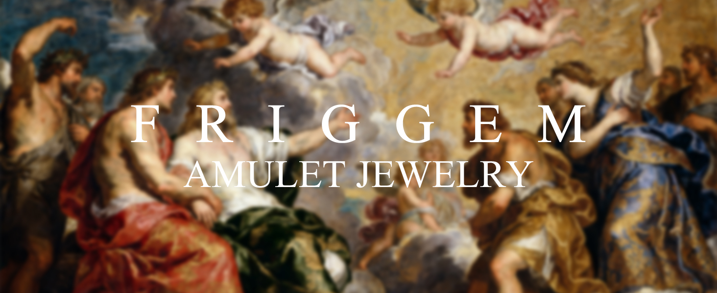 التصميم - قلادة سانت كريستوفر، تتميز بالقديس الذي يحمل المسيح عبر نهر مضطرب في وسطه. يقرأ النقش المحيط “القديس كريستوفر احمنا”. يمثل هذا تصميمًا كلاسيكيًا داخل المجوهرات الكاثوليكية.