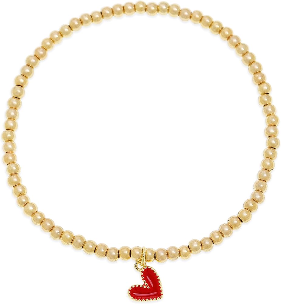 سوار على شكل قلب رقيق مطلي بالذهب، يتميز بأحجار كريمة حمراء متلألئة وخرز ذهبي، مما يضفي لمسة أنيقة على مظهرك.