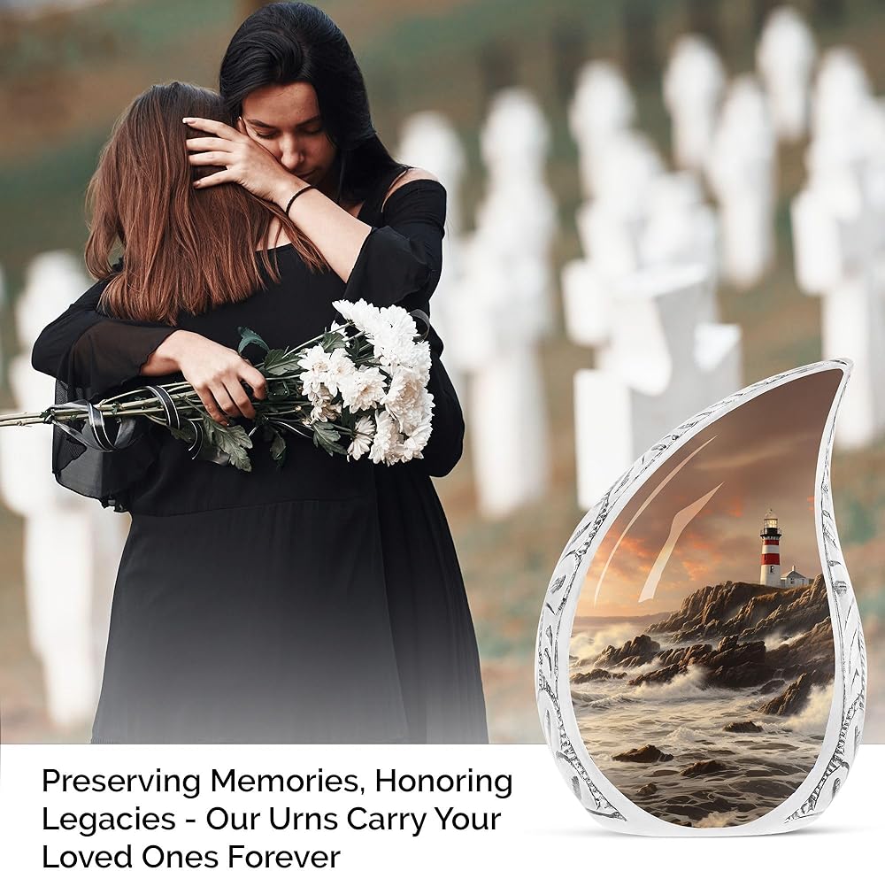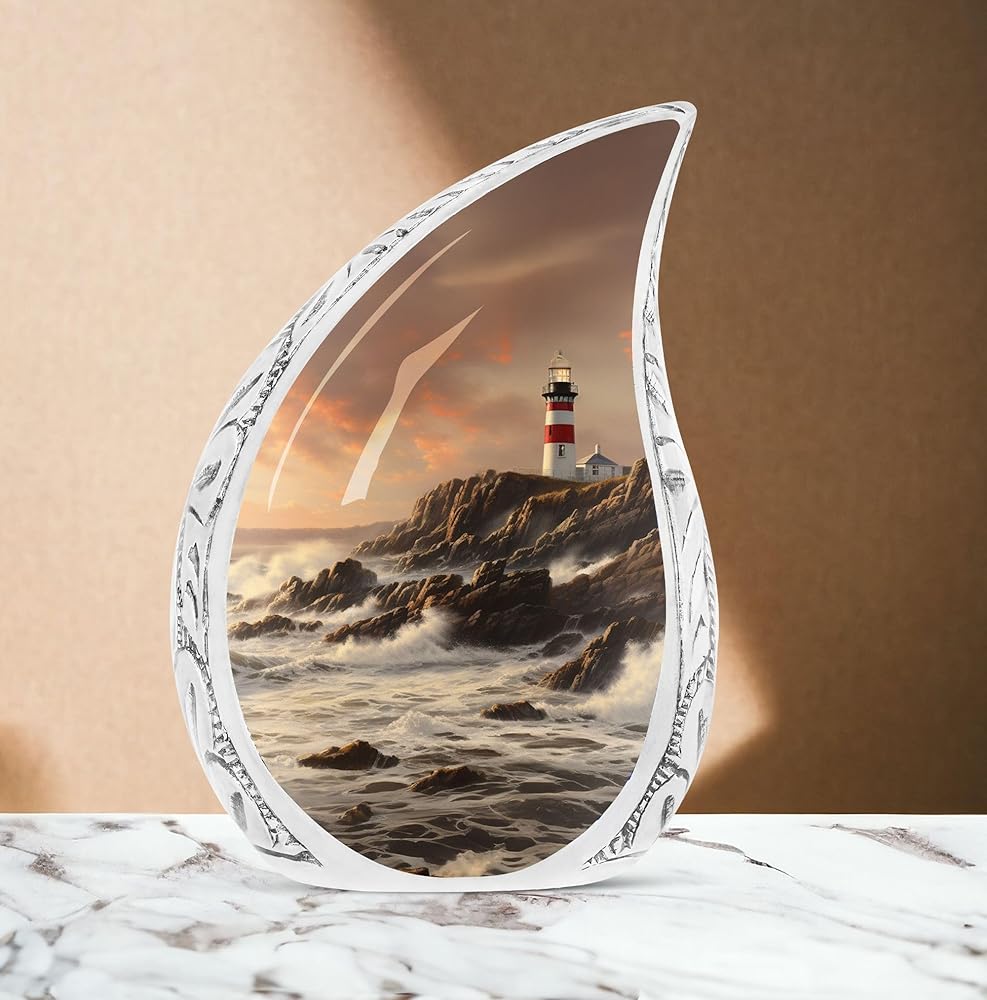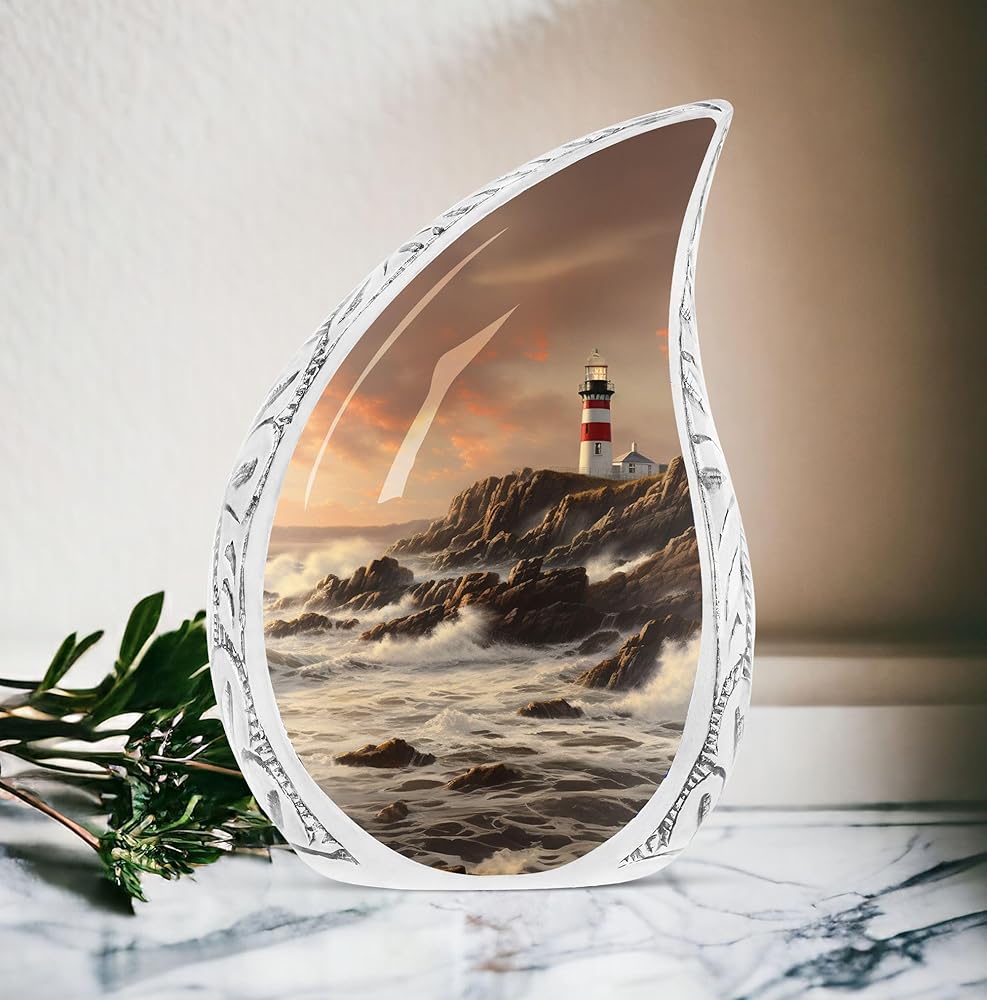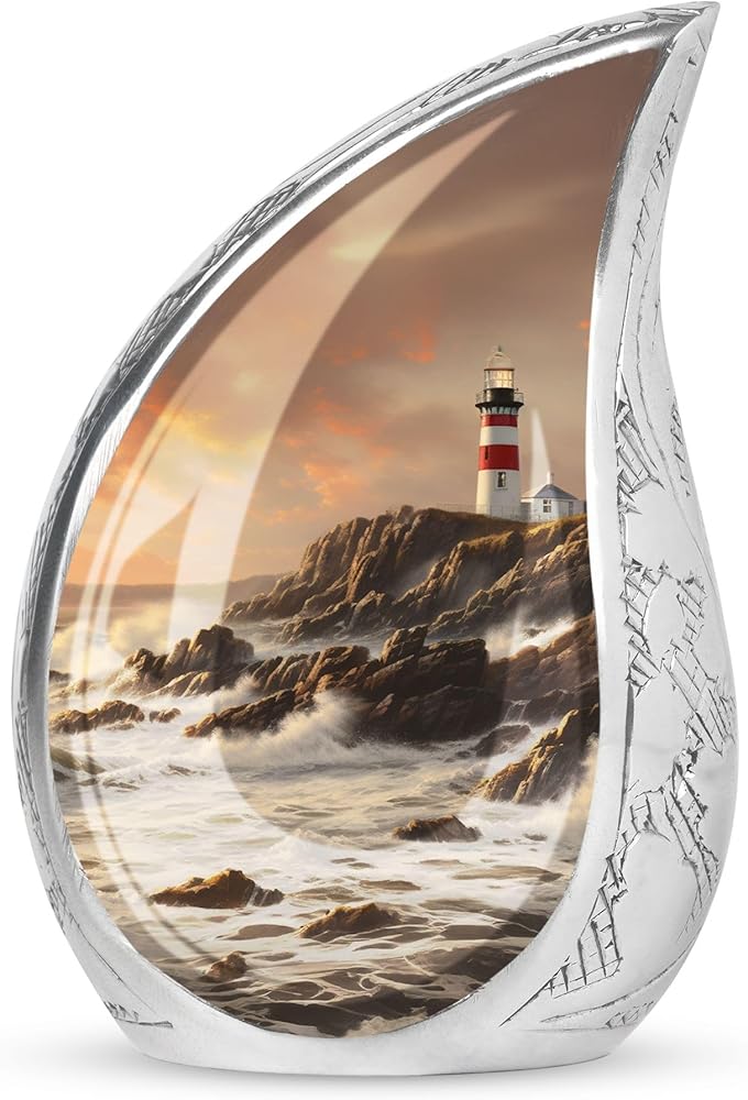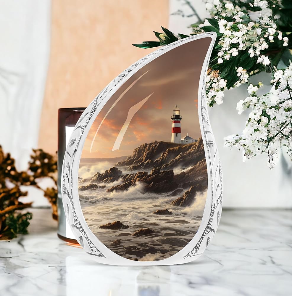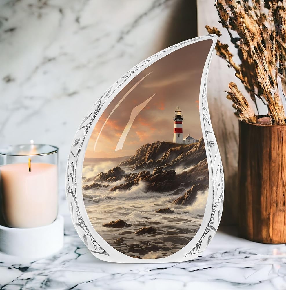 Cremation urn : The sunrise illuminates the horizon with warm hues, while the lighthouse symbolizes hope, strength, and unwavering guidance—creating a picturesque scene that embodies resilience.