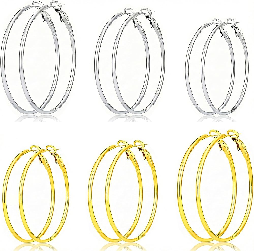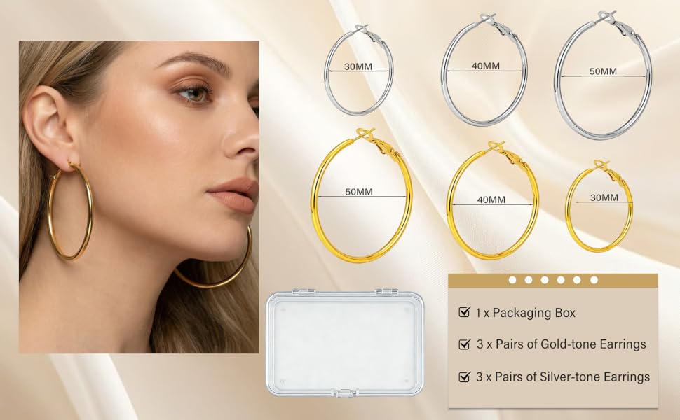 【مجموعة أقراط حلقية من الفولاذ المقاوم للصدأ لا تسبب الحساسية】مصنوعة من الفولاذ المقاوم للصدأ عالي الجودة/14 قيراط، هذه الأقراط الفضية خالية من النيكل والرصاص، مما يضمن الراحة للأذنين الحساسة، رائعة للاستخدام طويل الأمد دون تهيج، تحتوي هذه المجموعة على 3/6 أزواج من الأقراط الحلقية بأحجام مختلفة (30 مم، 40 مم، 50 مم)، ذهبي، فضي، ذهبي + فضي