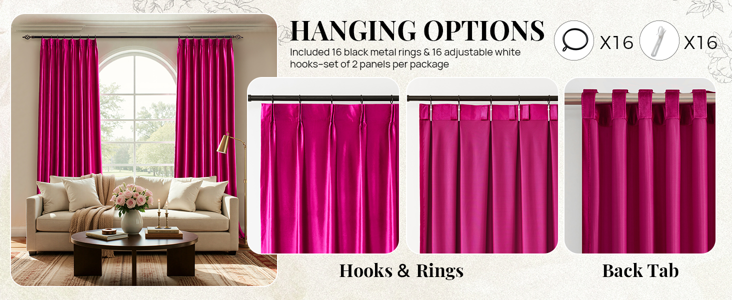 ستائر مطوية مضغوطة: ستائر مخملية فاخرة مطوية مضغوطة تحتوي على 3 خيارات للتعليق لتلبية احتياجات ديكور منزلك المختلفة: عروة خلفية، وخطافات حلقية وحلقات مشبك (المشابك غير متضمنة). تتميز كل لوحة ستارة مخملية أنيقة بـ 7 طيات مضغوطة و8 عروات خلفية، مما يخلق تجاعيد محسنة، وصورة ظلية منظمة ترفع المظهر العام.