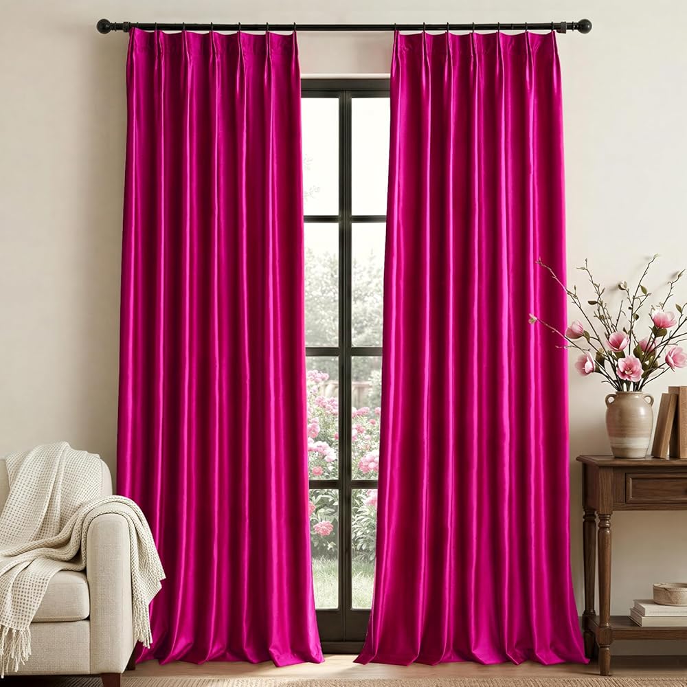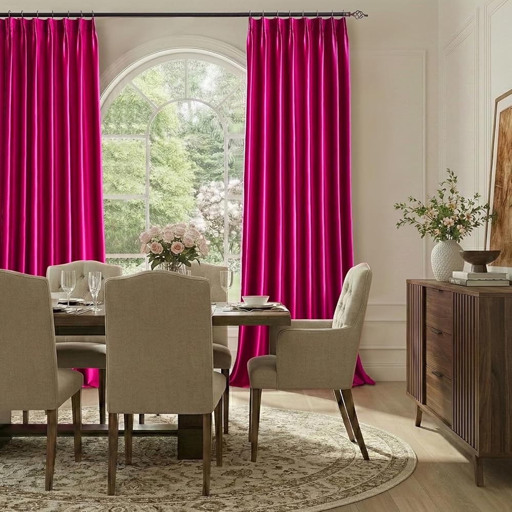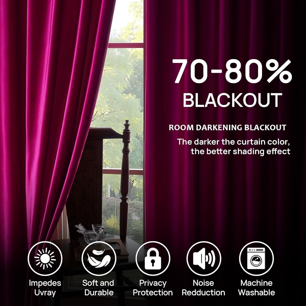 ستائر تعتيم الغرفة: قماش لامع وردي فاقع (بدون بطانة معتمة) عبارة عن كتل سميكة 70-80% (غير معتمة بالكامل) من ضوء الشمس، وتحجب الأشعة فوق البنفسجية من أجل جو مريح، والألوان الداكنة يمكن أن تحجب المزيد. نظرًا للنسيج السميك الثقيل، يمكن أن تقلل الضوضاء بنسبة 15% وتنتج تقنية وعزل حراري موفر للطاقة. توفر الخصوصية وتوفر تكلفة الطاقة، وتحمي الأرضيات والأثاث والأعمال الفنية الخاصة بك من أضرار الشمس وتضمن أن تلامس الستائر الأرض السقف.