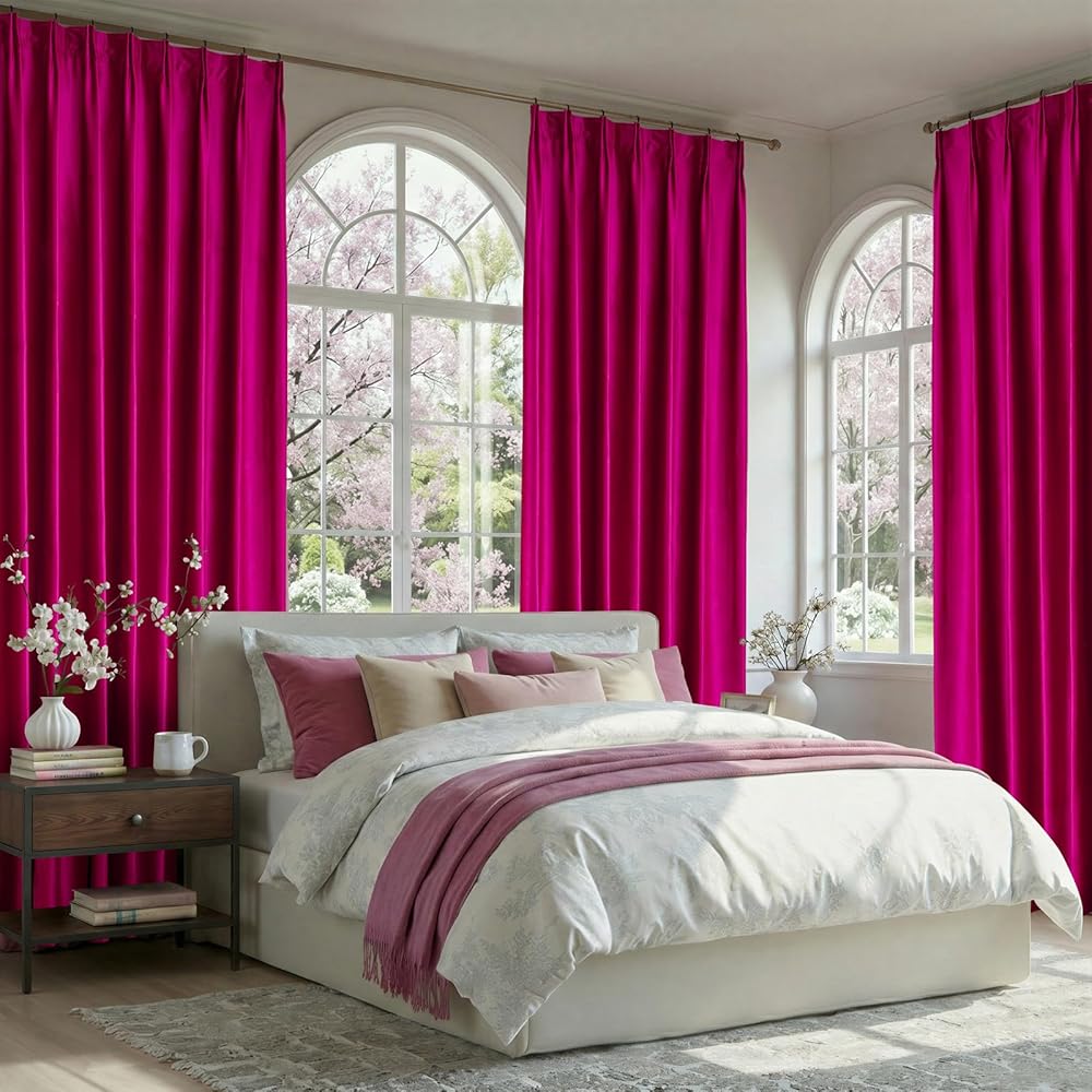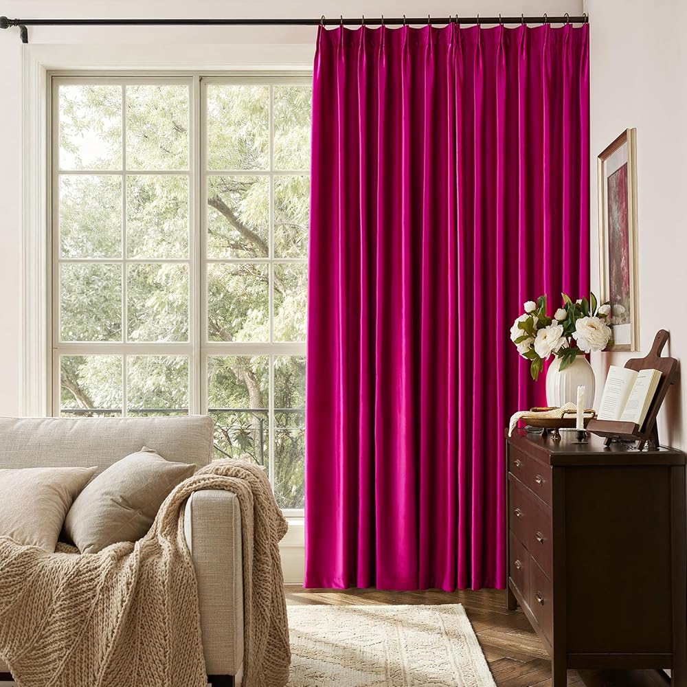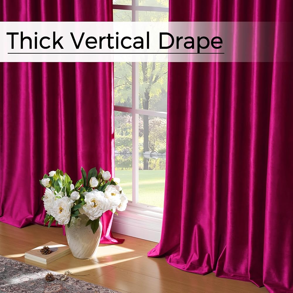 نسيج مخملي فاخر للغاية: تستخدم الستائر مخمل بوليستر نبيل وردي فاقع مع نسيج سميك ثقيل 280 جرامًا للمتر المربع بدون بطانة، فهي ذات ملمس قطيفة حريري ولمعان أنيق، فائقة النعومة، ناعمة ولامعة، ستائر لطيفة جدًا عند اللمس. ستائر ذات ملمس مجعد أرجواني فوشيا يمكن أن تضفي مظهرًا أكثر فخامة على المنزل ومناسبة للديكور، القماش يتمتع بمقاومة ممتازة للبهتان، ولا يبهت بعد الغسيل المتكرر، قوي جدًا ومتين.