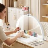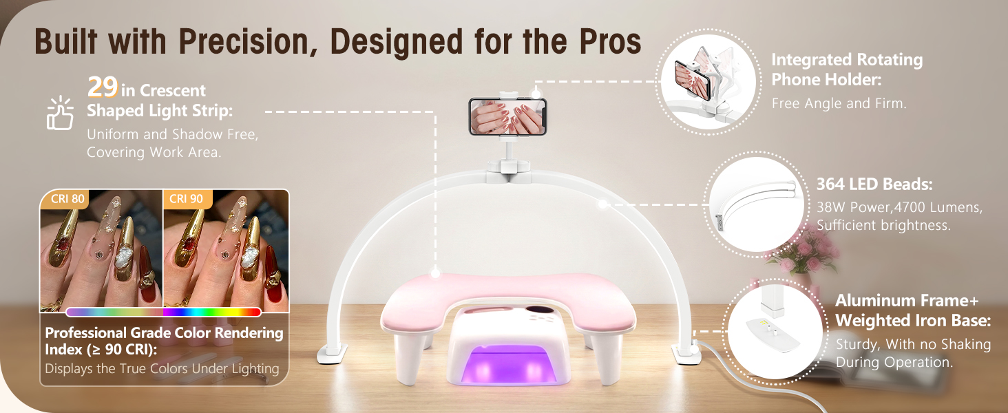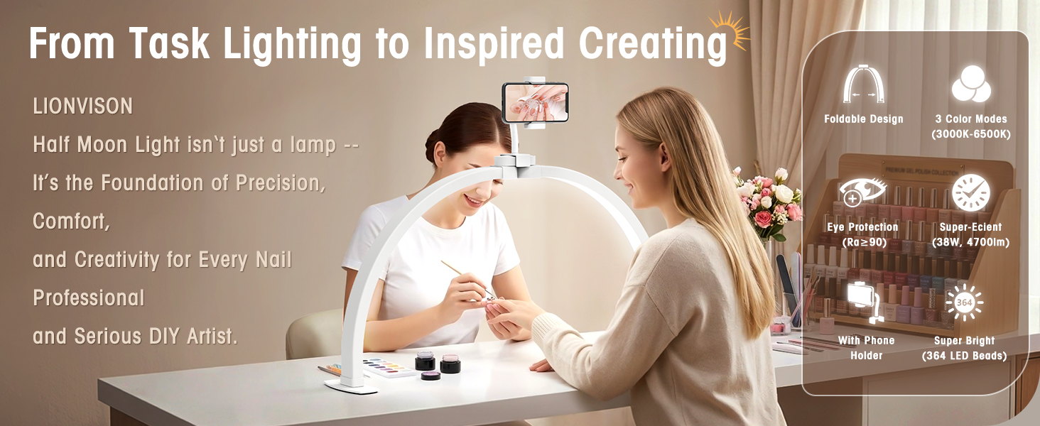 تصميم قابل للطي وموفر للمساحة: قم بزيادة مساحة العمل الخاصة بك إلى أقصى حد من خلال مصباح مكتب نصف القمر القابل للطي والذي يمكن طيه بسهولة للتخزين أو النقل المدمج. يتم تركيبه بسرعة على أي طاولة أو مكتب للأظافر دون استهلاك مساحة قيمة، وهو مثالي لفنيي الأظافر المتنقلين أو الاستوديوهات المزدحمة. إطار ألومنيوم قوي وقاعدة حديدية ثابتة توفر أداءً موثوقًا خلال الجلسات الطويلة، سواء كنت تعمل في صالون التجميل، أو تحضر منزل العميل، أو الاستوديوهات المنزلية.
