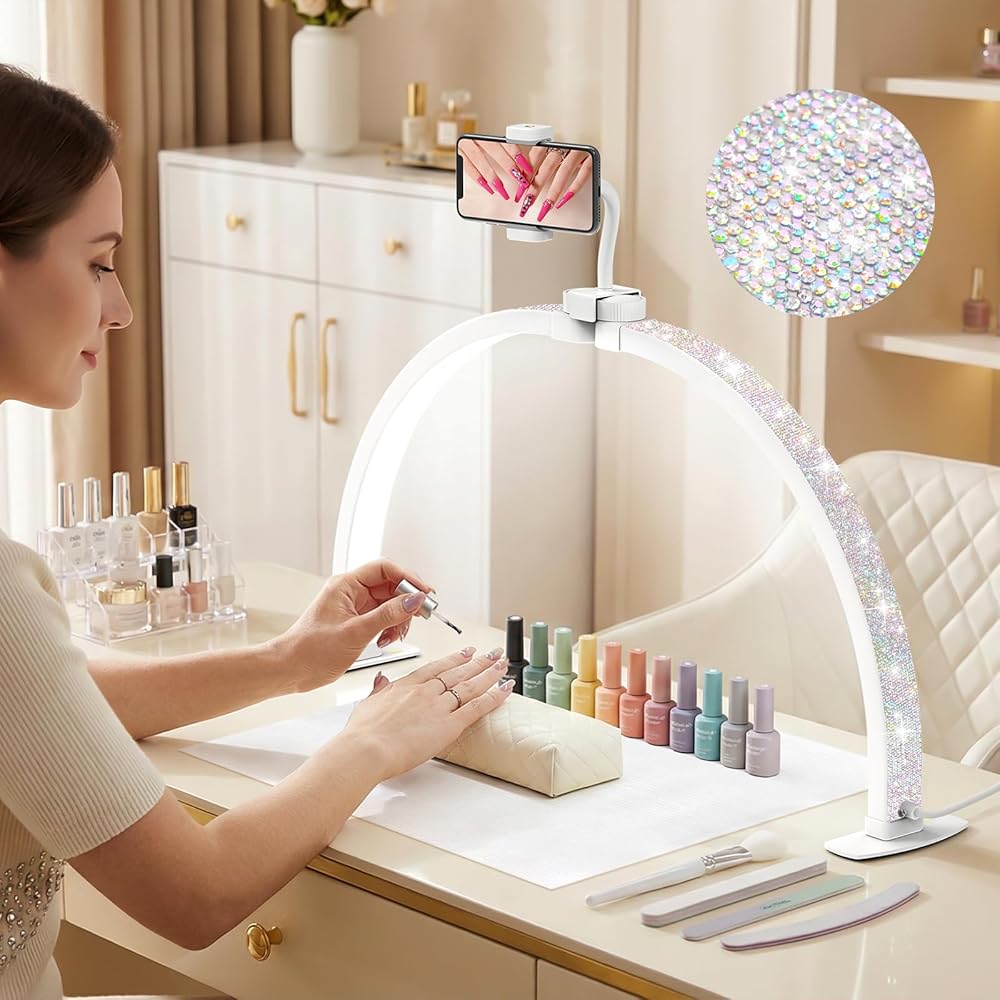 حامل هاتف مدمج قابل للدوران: مع حامل الهاتف، مصمم لتعزيز إنتاجيتك وإبداعك. قم بتدويره إلى الزاوية المثالية لمشاهدة دروس الأظافر، أو مكالمات الفيديو مع العملاء، أو تشغيل الموسيقى، مما يسمح لك بتدوير الزوايا للعرض بدون استخدام اليدين أثناء التركيز على تطبيقات الأظافر، وهو مفيد لمتابعة دروس فن الأظافر، أو تتبع الوقت، أو التقاط صور لعملك النهائي. يعمل مصباح مكتب الأظافر مع حامل الهاتف على تعزيز الراحة للمحترفين والهواة.