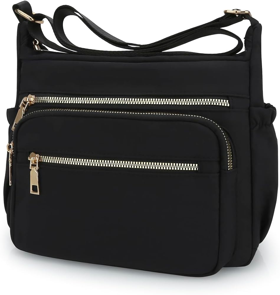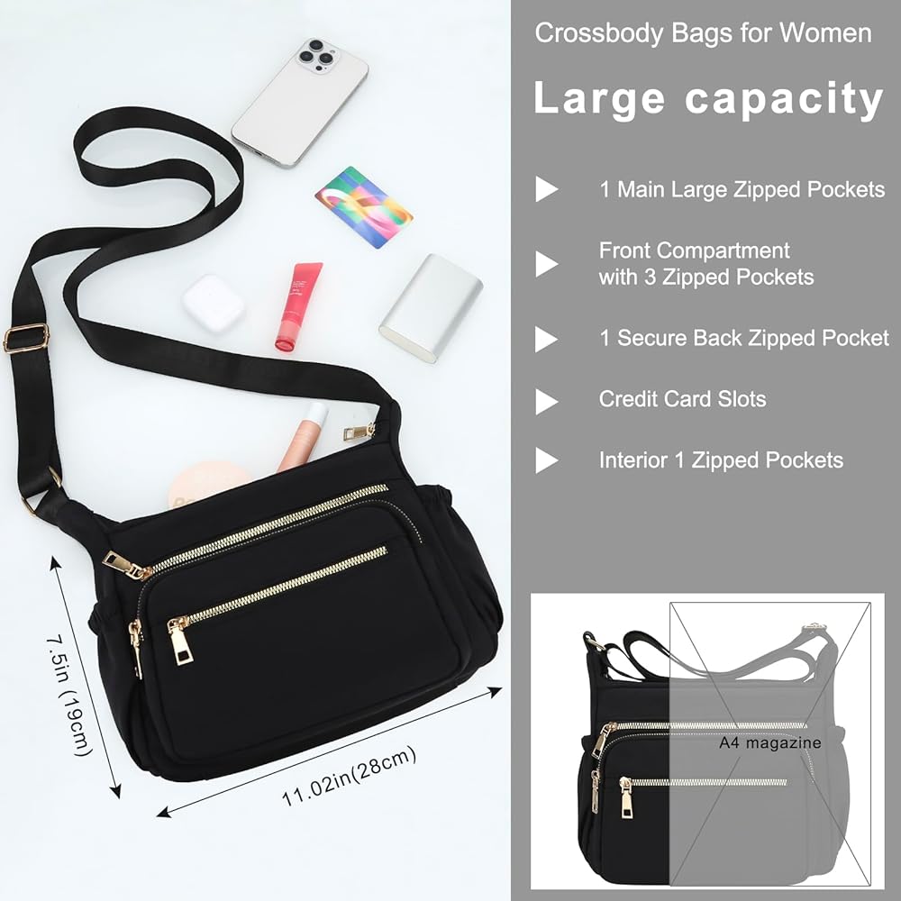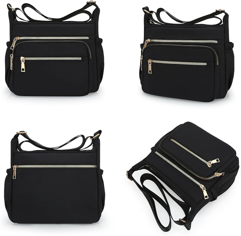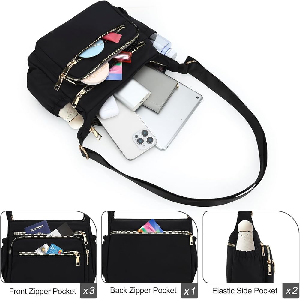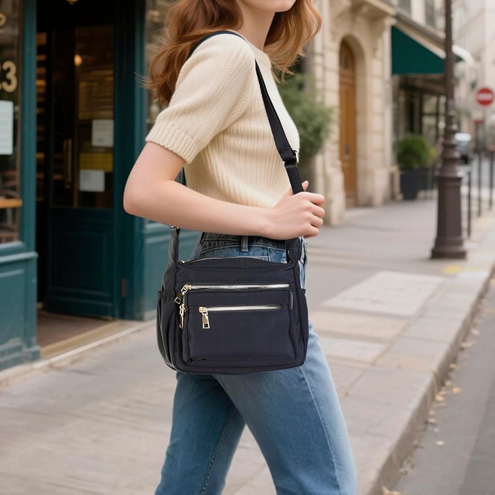 JINSI Nylon Crossbody Bags for Women Purses, Travel Casual Shoulder Handbag with Waterproof and Multi-Pockets, Tote for Daily Commuting, Work, Black
