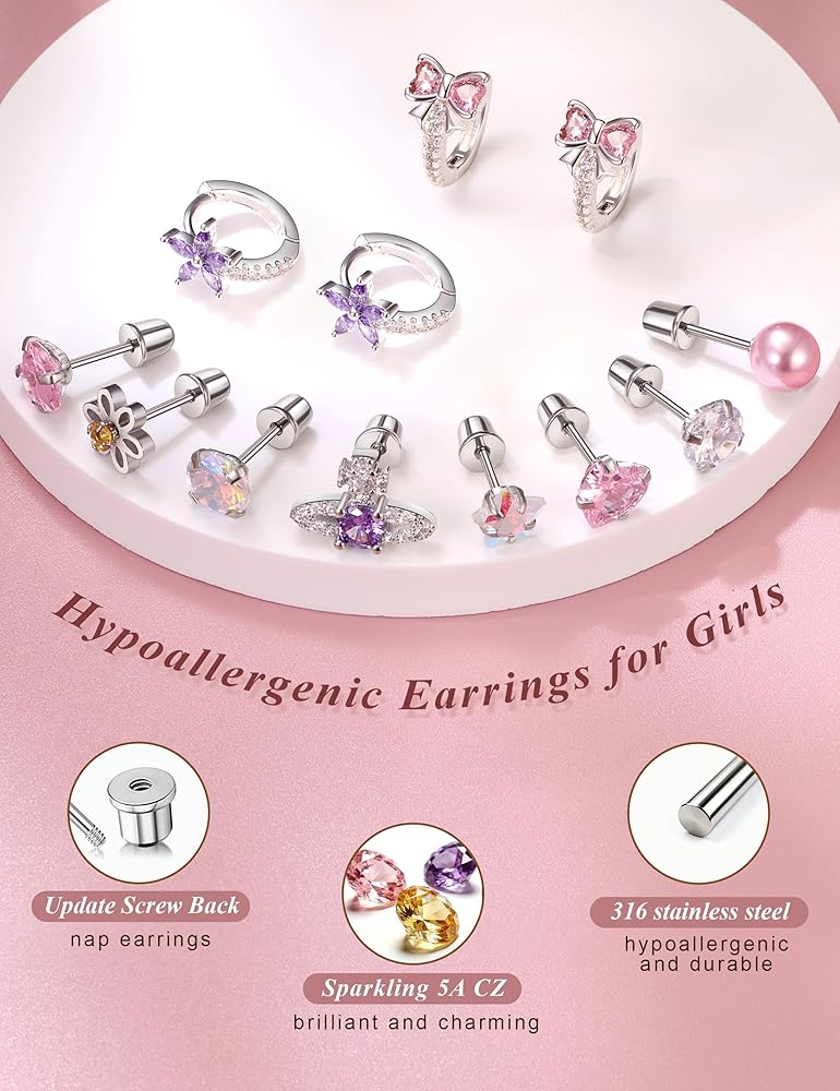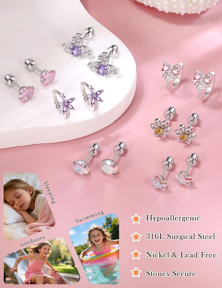 • تتميز هذه الأقراط للفتيات بقفل خلفي آمن، تبقى ثابتة في مكانها، مما يقلل من خطر الفقد أو البلع العرضي، وهي مناسبة للأطفال النشطين في الأنشطة اليومية والخارجية.