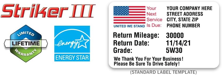 ضمان الضمان: استمتع براحة البال مع الضمان المتضمن. تأتي حزمة نظام طباعة التذكير بخدمة الزيت Striker III V4.0 مع ضمان شامل، مما يوفر تغطية لأي عيوب أو مشكلات محتملة في التصنيع. يوضح هذا الضمان التزامنا بتقديم منتج موثوق ومتين، مدعومًا بثقتنا في جودته.