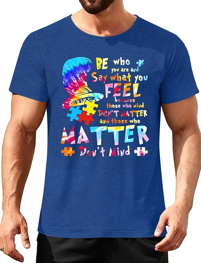 Features: Blue autism awareness shirt men, april wear blue autism t shirt, autism puzzle graphic tees, features funny autism awareness themed graphic prints, symbolizing understanding and acceptance of the autism community