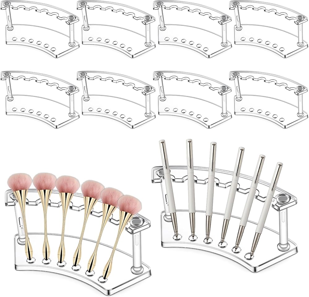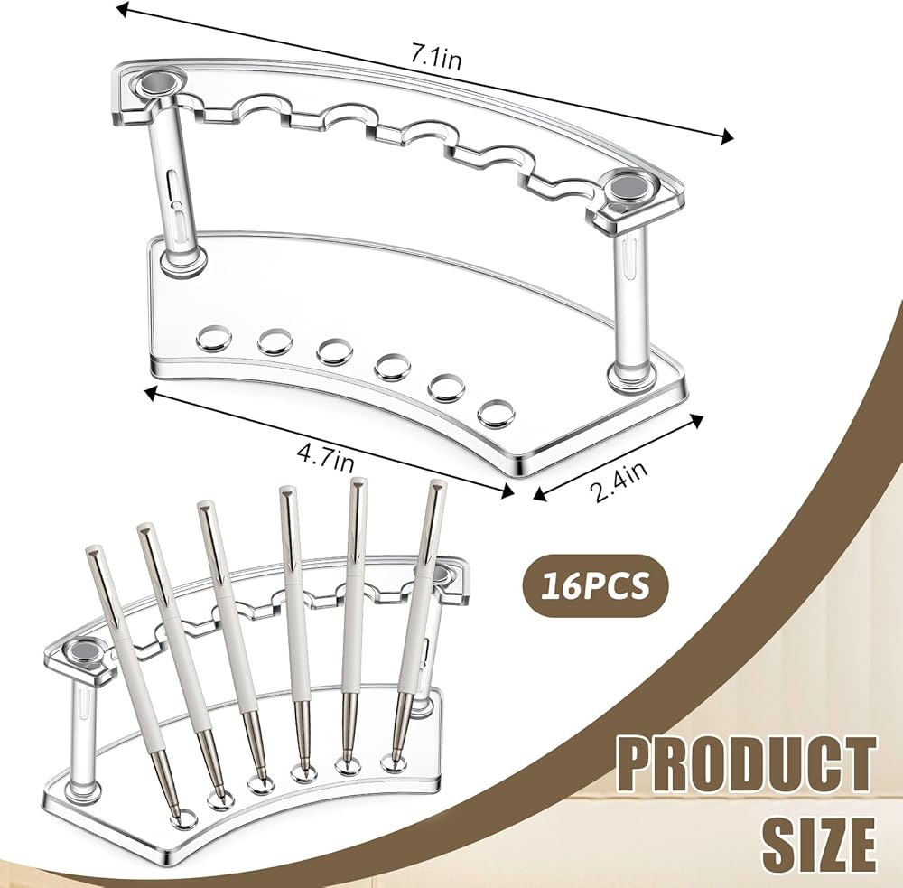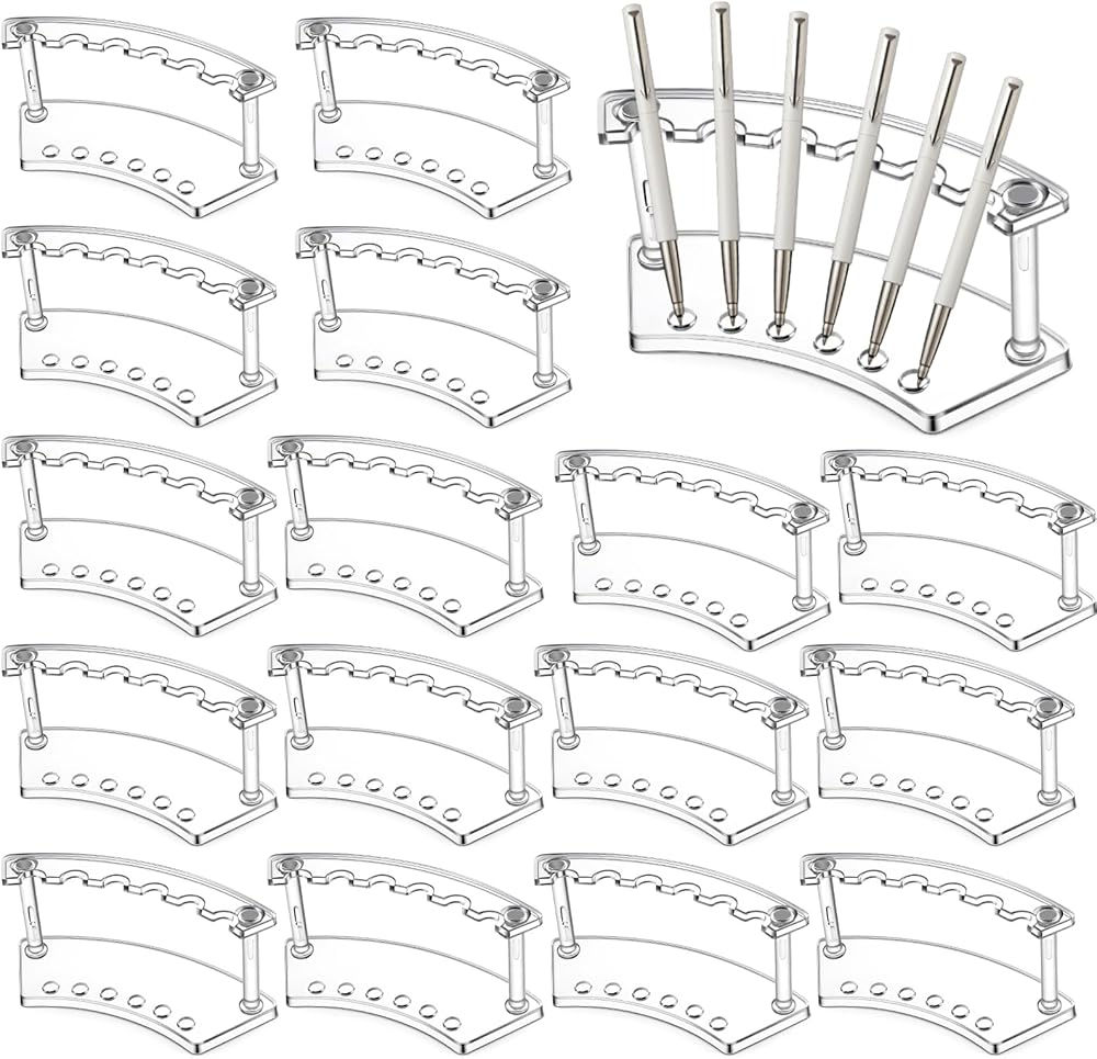 Pen Display Stand: You will get 16 pieces of clear plastic pen holders, which are made of quality plastic, well-made and durable. Featuring a semi-circular, flat bottom, this pen display conveniently stands on its own on any table or desktop. Attracting attention wherever it's placed, this unique design will create a distinctive and stylish display for your pens.