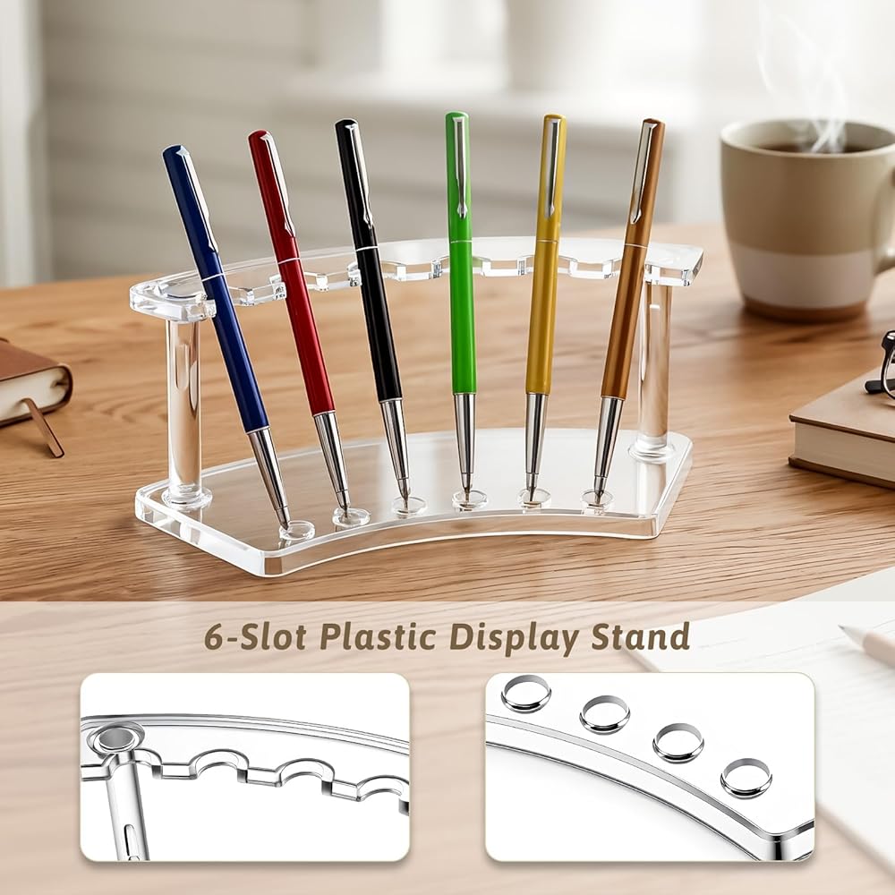 6-Slot Plastic Display Stand: The vertical display stand has 6 slots, each slot works well in holding the pen in place, thus, so that your pens can be seen at a glance and you can easily and quickly find your desired pen; You can use this plastic display rack to organize pens, pencils, or markers on a flat surface and no longer spend time searching for them.