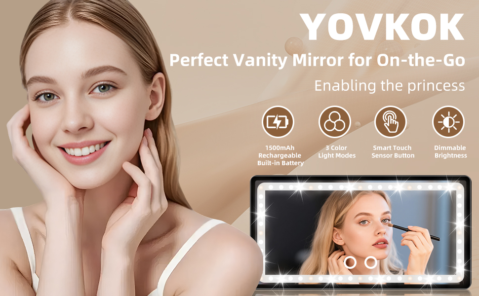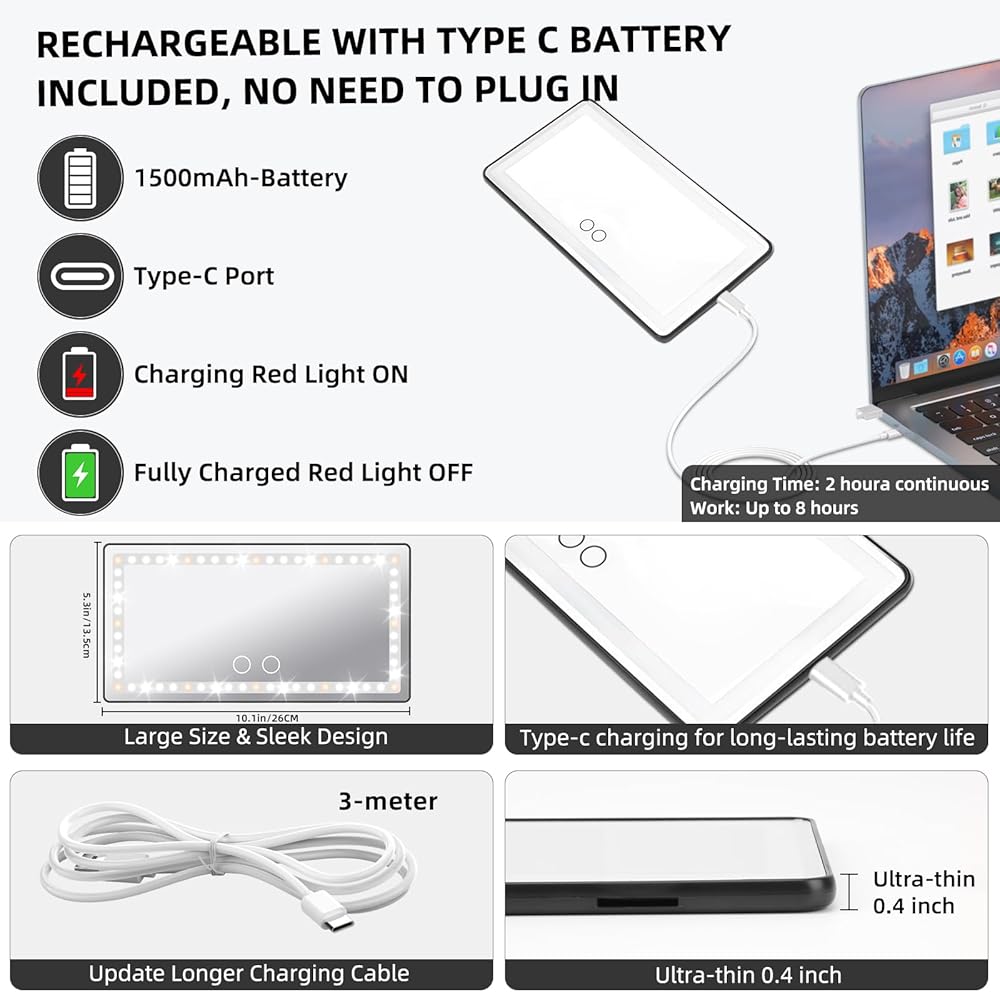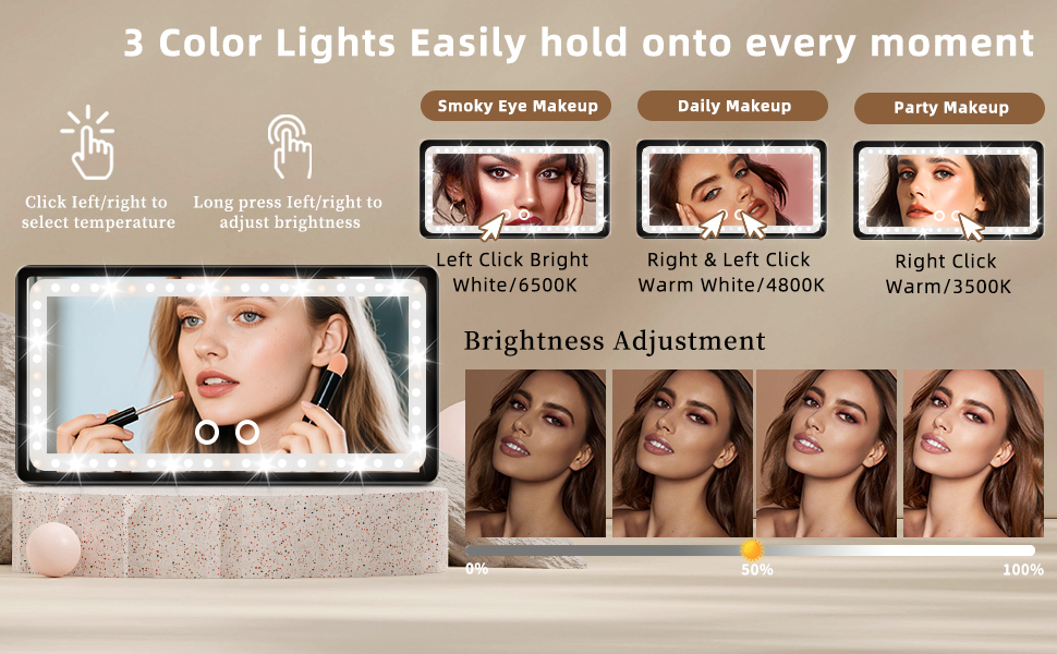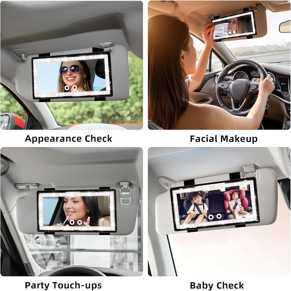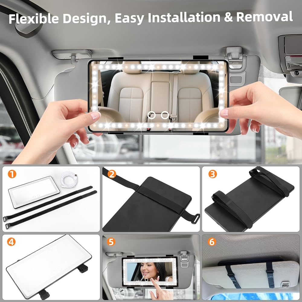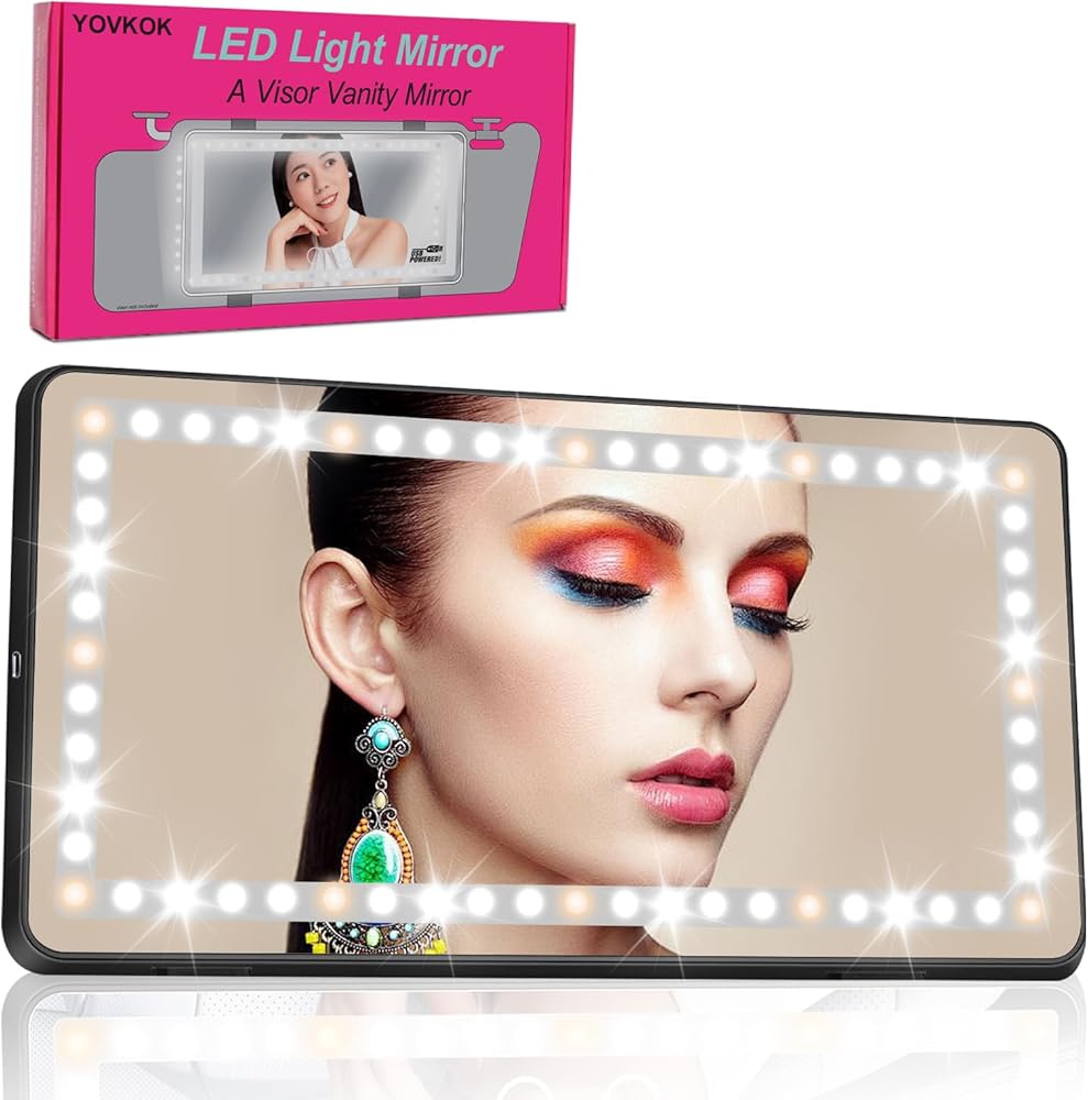 • 【مصابيح LED خافتة وتصميم موفر للطاقة】تتميز هذه المرآة للسيارة بـ 48 مصباحًا أبيض و12 مصباحًا أصفر، وهي أكثر إشراقًا وتستخدم طاقة أقل من المصابيح العادية. اضغط لفترة قصيرة على مفتاحي مستشعر للتبديل بين ثلاثة أوضاع ألوان فاتحة. درجة حرارة اللون 2500-6500 كلفن تعادل ضوء الشمس الخارجي، مما يضمن أن يبدو مكياجك خاليًا من العيوب وحقيقيًا.