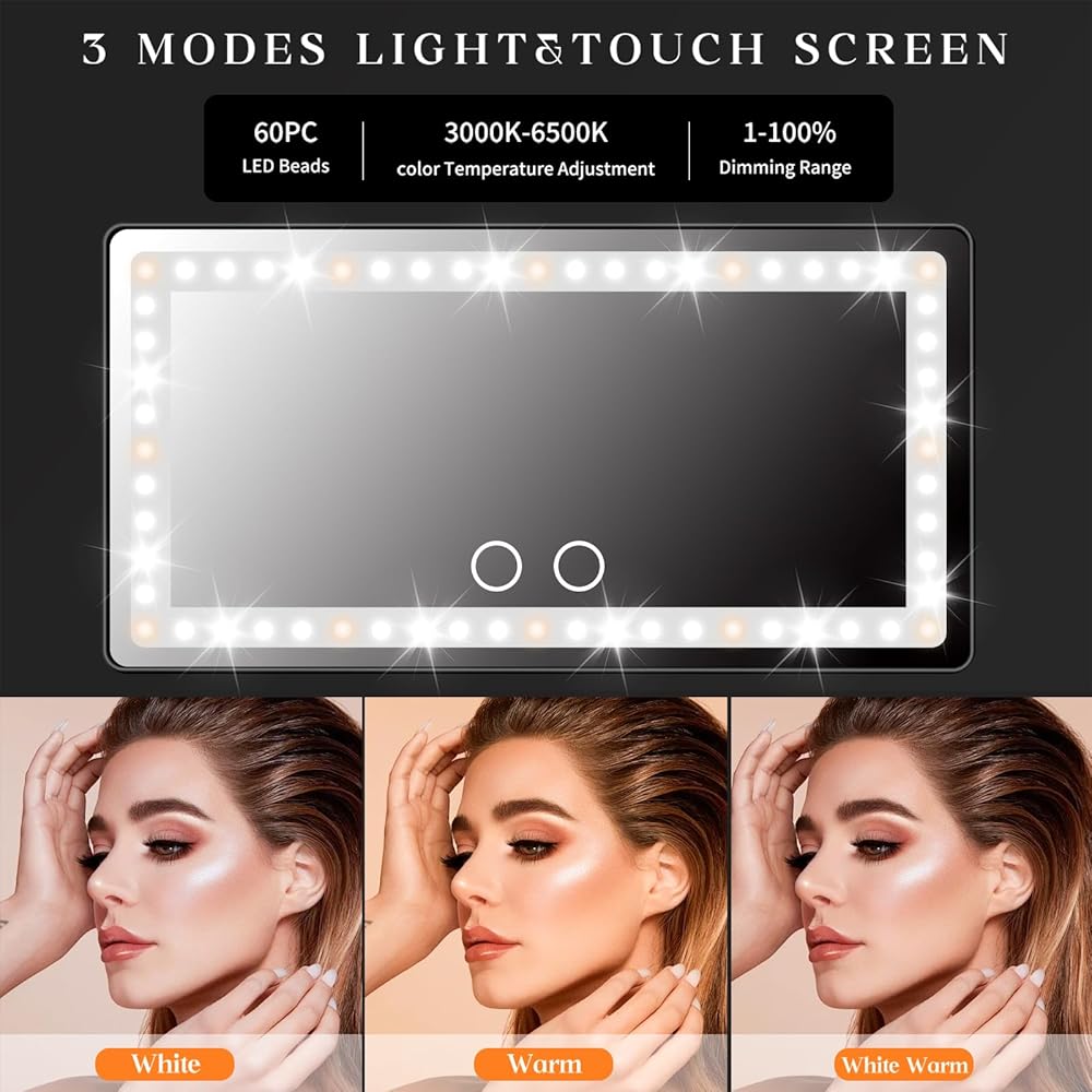مرآة زينة بواقي من الشمس، مرآة مكياج للسيارة مع 3 أوضاع إضاءة و60 مصباح LED، شاشة تعمل باللمس قابلة لإعادة الشحن، ملحقات سيارة للنساء والفتيات، عالمية لسيارات الدفع الرباعي