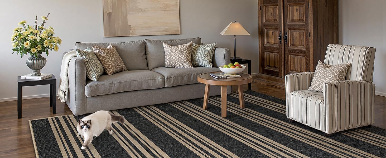• سجادة الجوت الهندسية PureCozy: تعرض خطوطًا محايدة بنمط خط هندسي نظيف، ومزخرفة بشكل هادف وطبيعي في التصميم، مما يجعلها خيارًا رائعًا لترسيخ جماليات المزرعة الحديثة