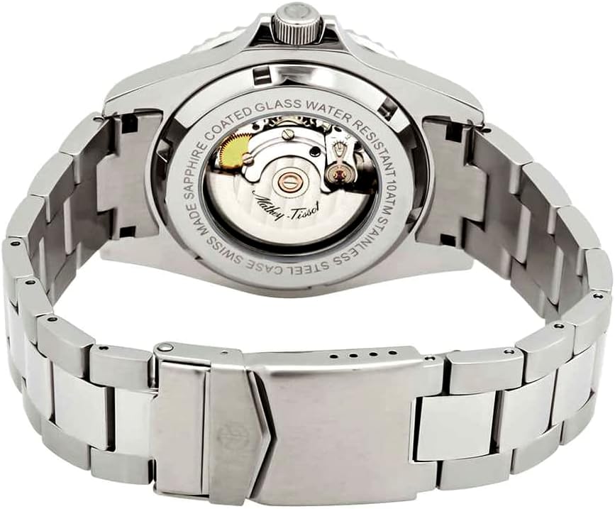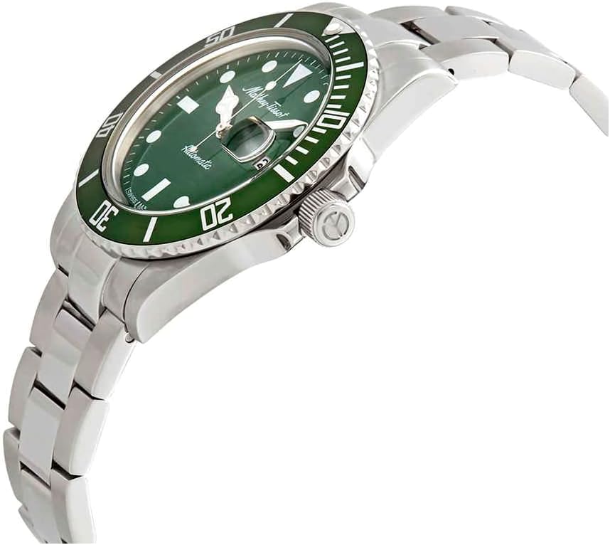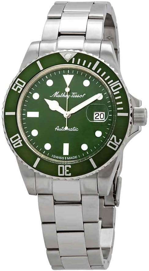 Green dial. Silver-tone stainless steel case with a silver-tone stainless steel band. Automatic movement. 100 meters / 330 feet water resistance. Uni-directional Rotating bezel. Fold Over clasp. Case size 42 mm x 10 mm. Mathey-Tissot H9010ATV Mathey Vintage Watch.