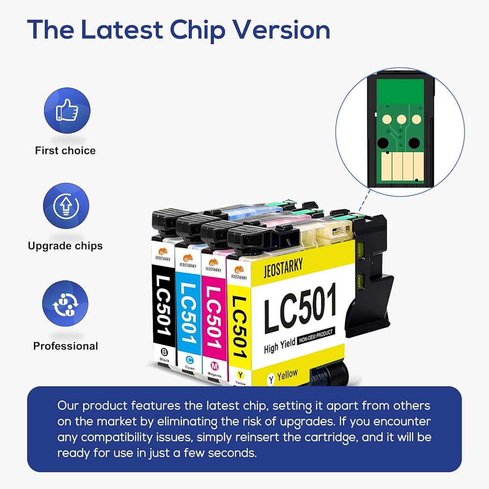 توافق موثوق: خراطيش حبر LC 501 المتوافقة مع أحدث رقائق Jeostarky لأحبار سلسلة LC501 المتوافقة مع طابعة Brother تضمن الحصول على ألوان نابضة بالحياة ونصوص واضحة، والتثبيت بسلاسة