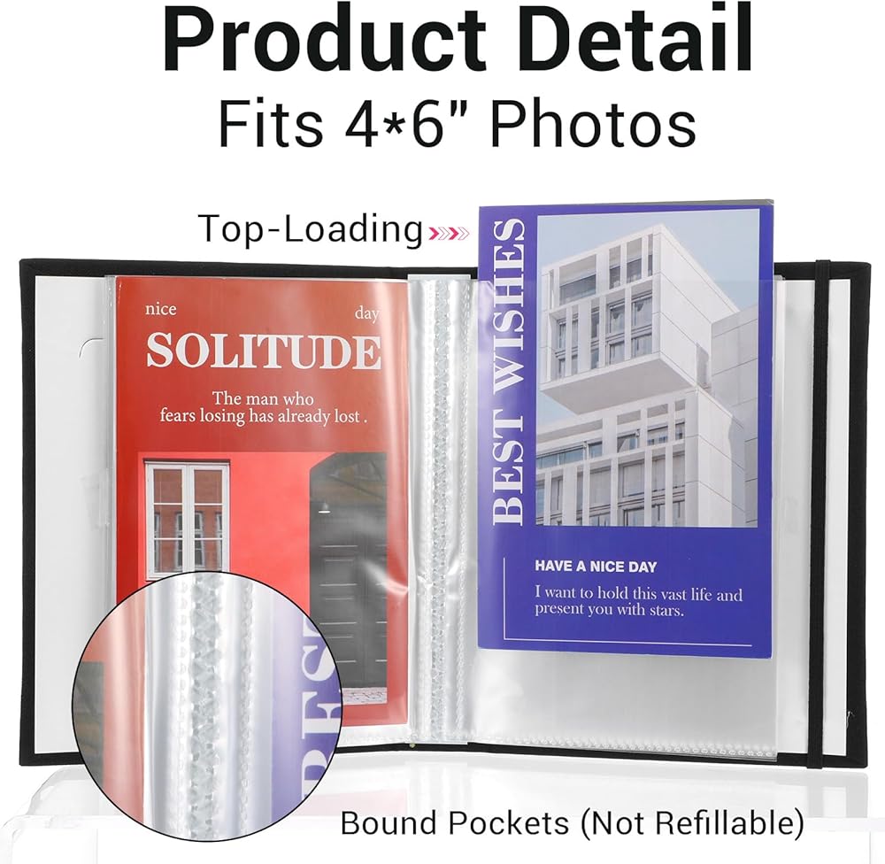 Each photo album measures 6.5 x 5.1 inches with convenient top-loading sleeves, allowing quick and easy insertion of your 4x6 pictures while keeping them securely in place and organized for beautiful display.