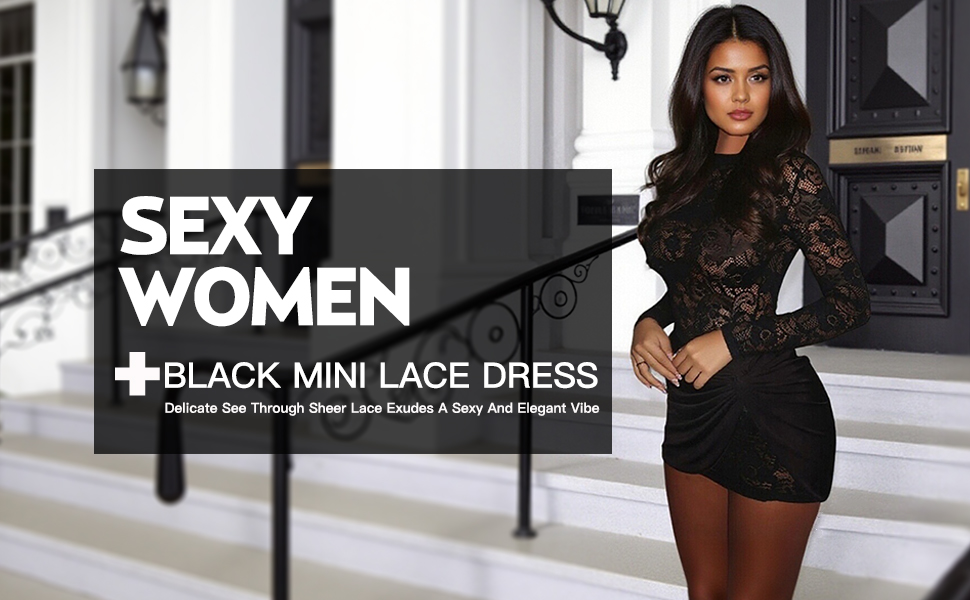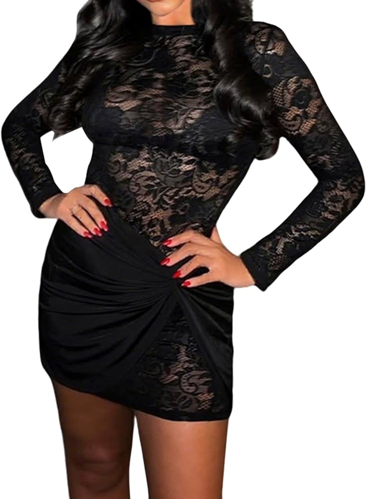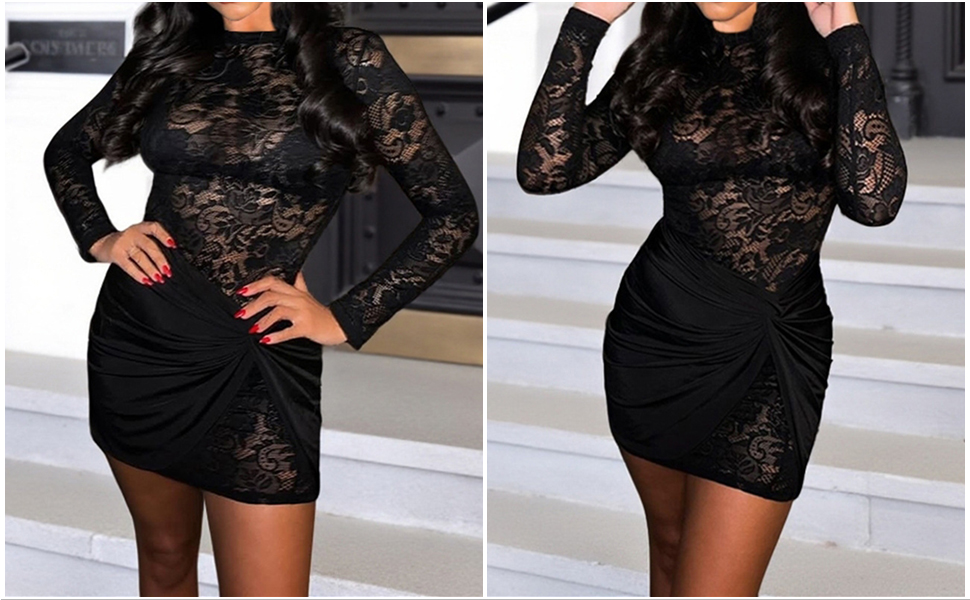 • المزايا: فستان نسائي قصير مثير بأكمام طويلة، فستان قصير ضيق برقبة وهمية، فستان قصير من الدانتيل الشفاف، فستان دانتيل شفاف، تنورة قصيرة ملفوفة قابلة للإزالة، نمط دانتيل زهور رقيق، لون ثابت، فساتين قصيرة مثيرة للحفلات والنوادي