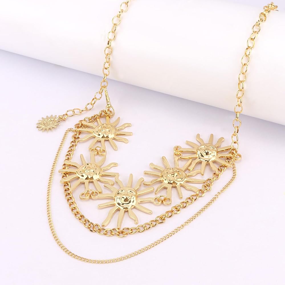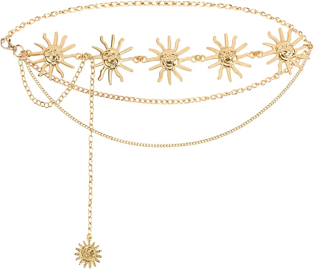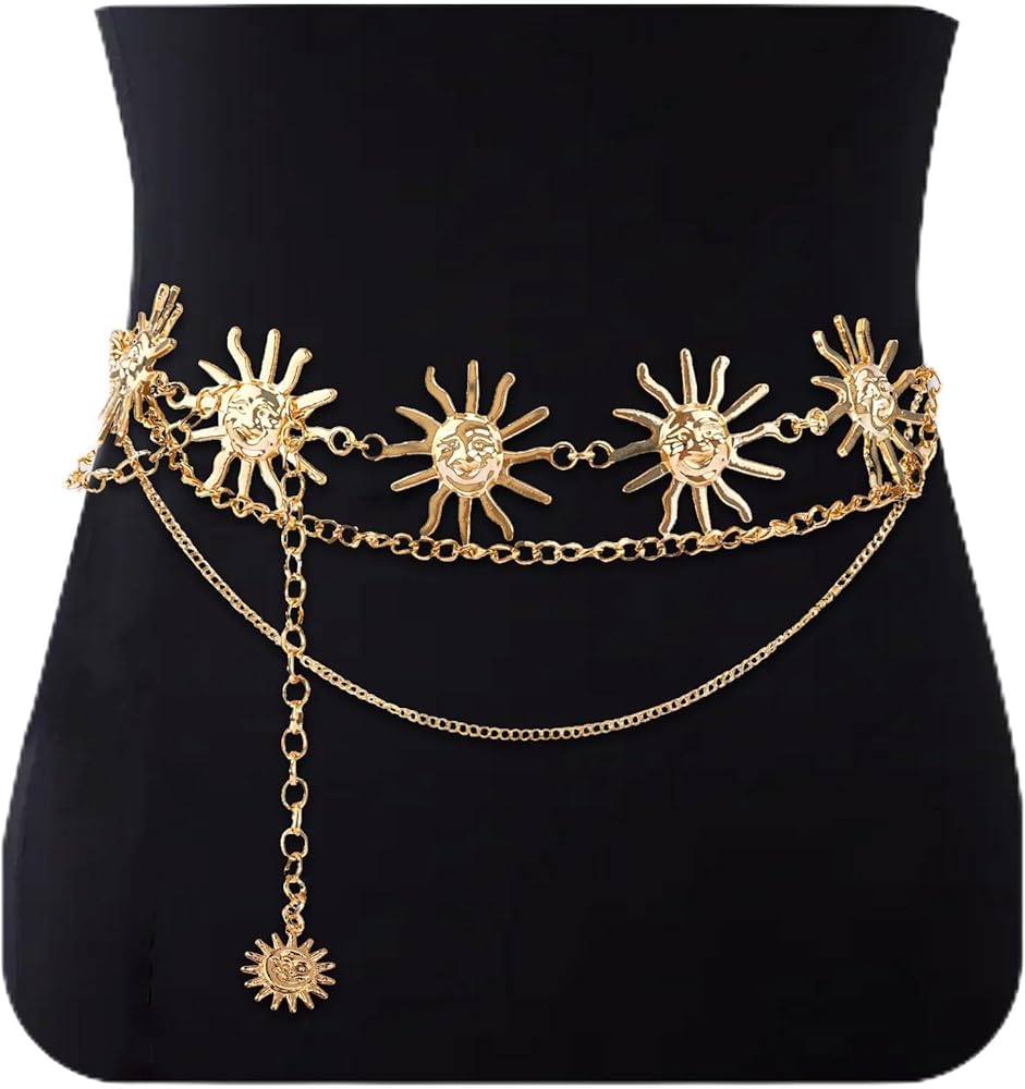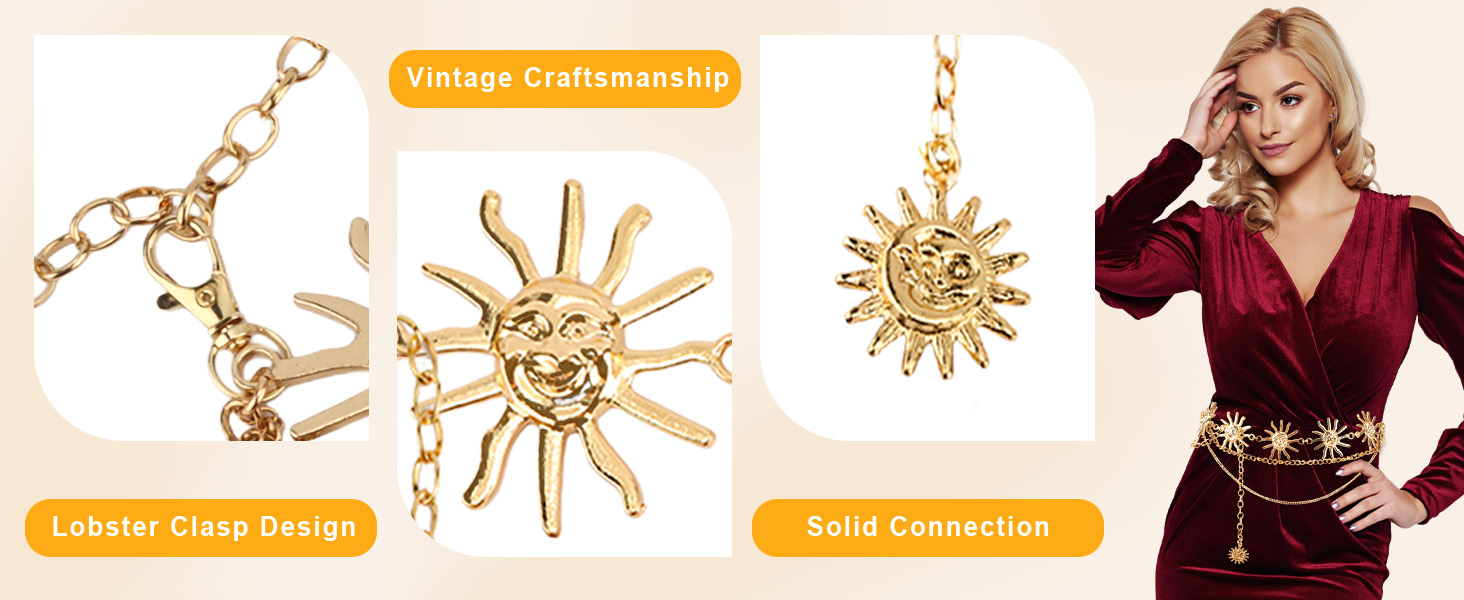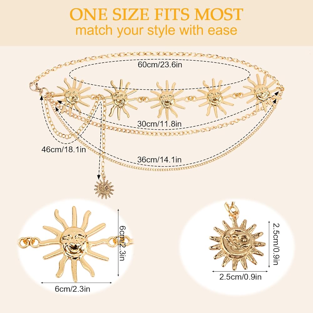 【تصميم فريد】يتمحور حزام الشمس هذا حول شكل شمسي ملفت للنظر، ويتميز بسلاسل معدنية رقيقة للحصول على مظهر عصري مميز. إنه يجذب الانتباه دون عناء ويرفع من مستوى أي جماعة بذوقه الفني.